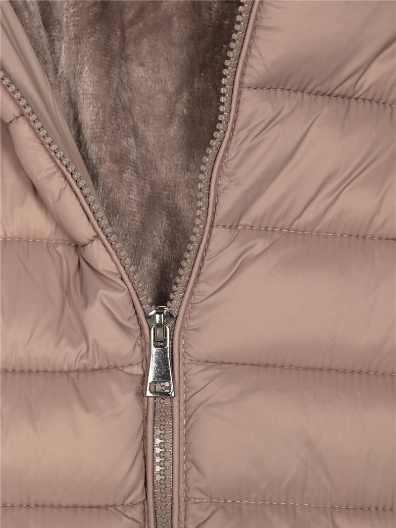 Langer Anorak über dem Knie. Gepolstert. Seitentaschen mit unsichtbaren Reißverschlüssen. Innenfutter mit Fell-Effekt in passender Farbe. Abnehmbare Kapuze. Stehkragen. Lange Ärmel. Zentraler Reißverschluss.