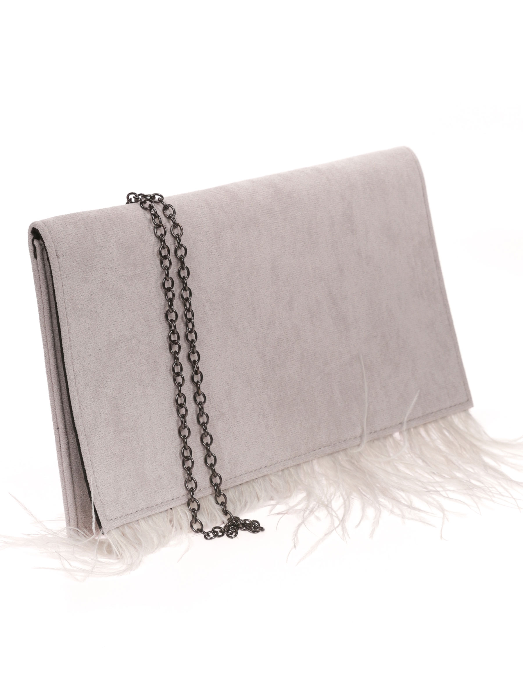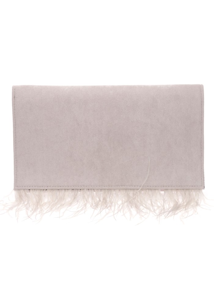 Abendtasche aus hellgrauem Wildleder mit Federn