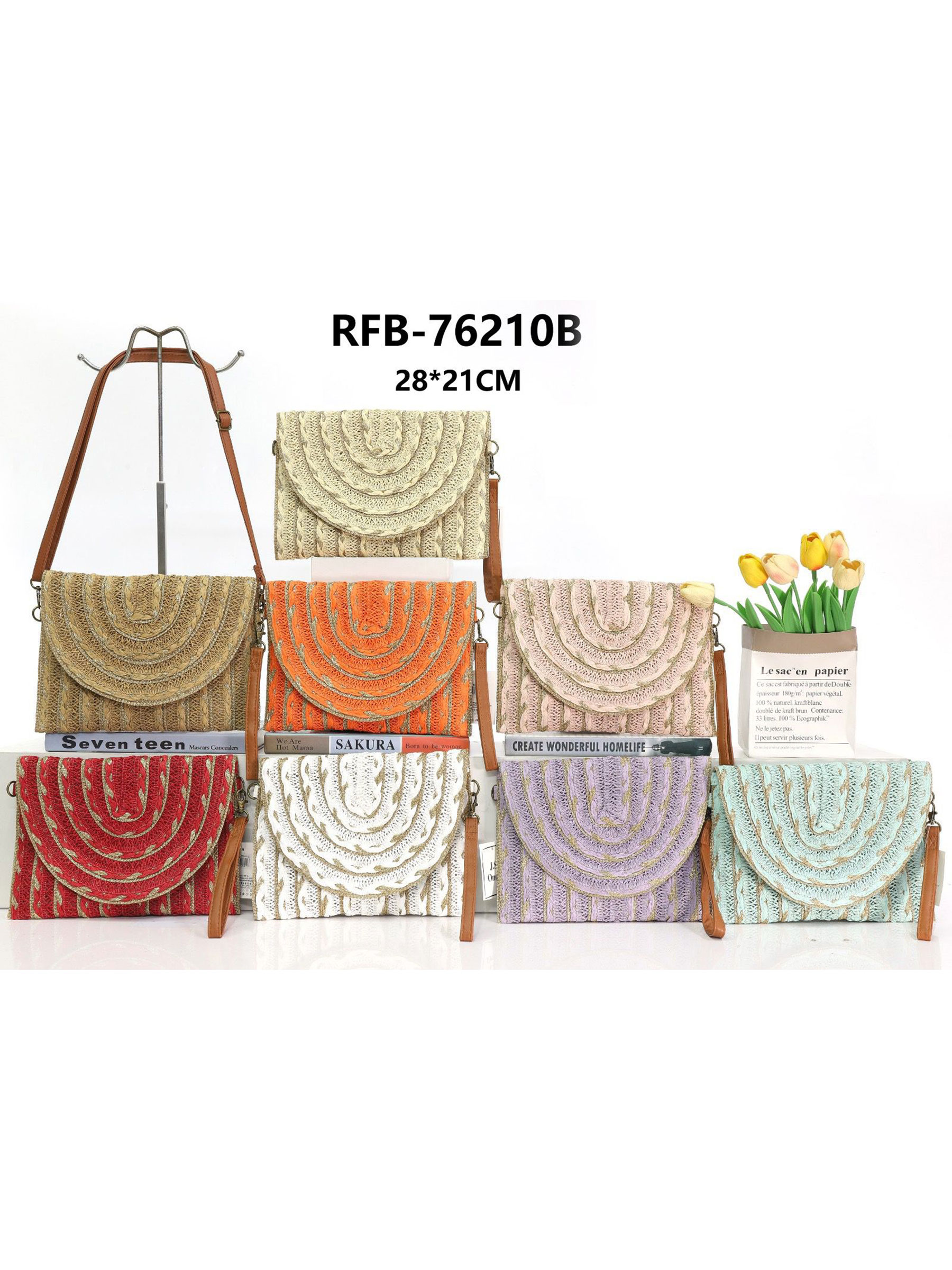 Raffia-Umhängetasche mit halbkreisförmiger Klappe.