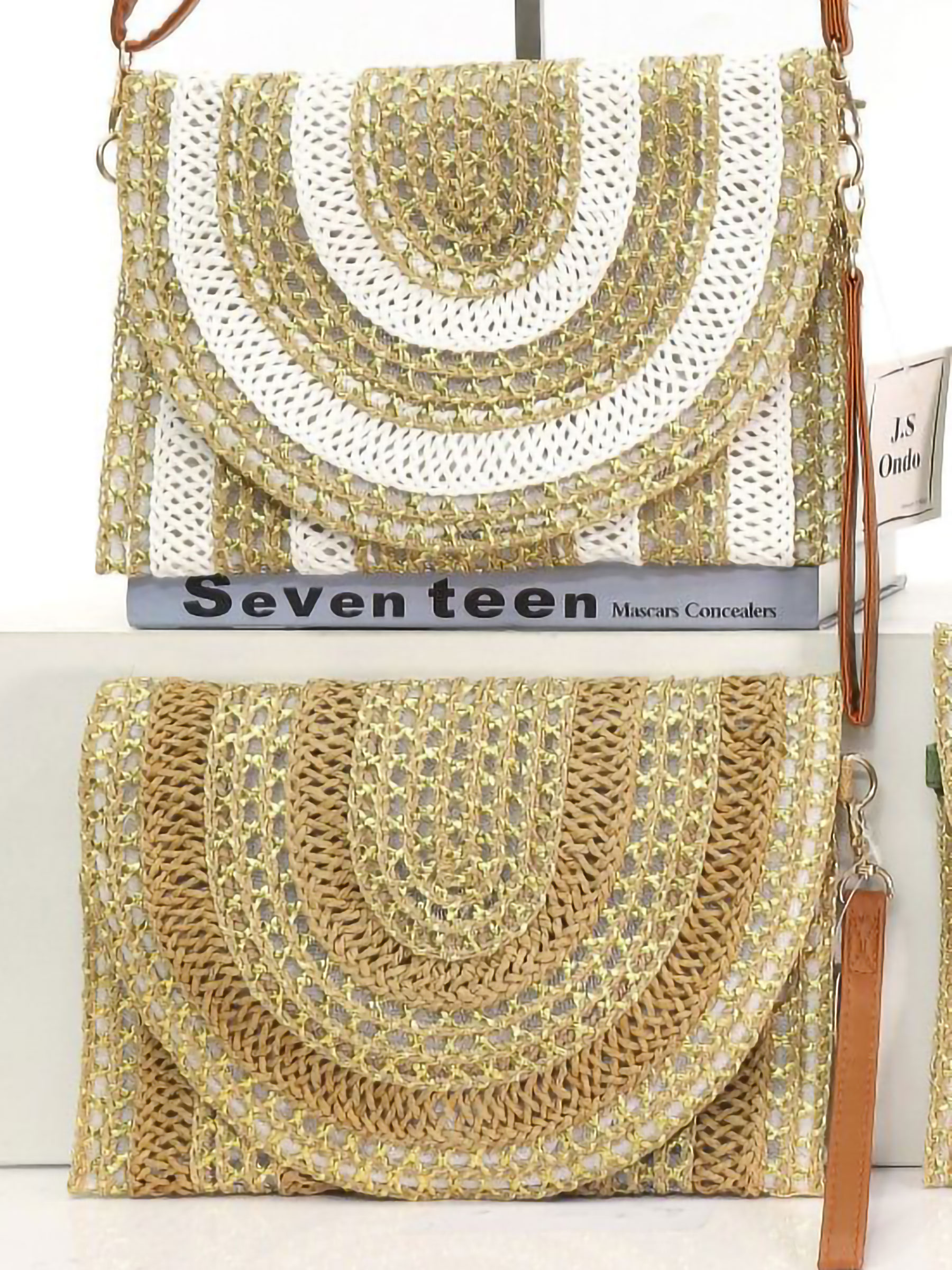Boho-Umhängetasche aus Bast mit Glitzer und halbkreisförmiger Klappe