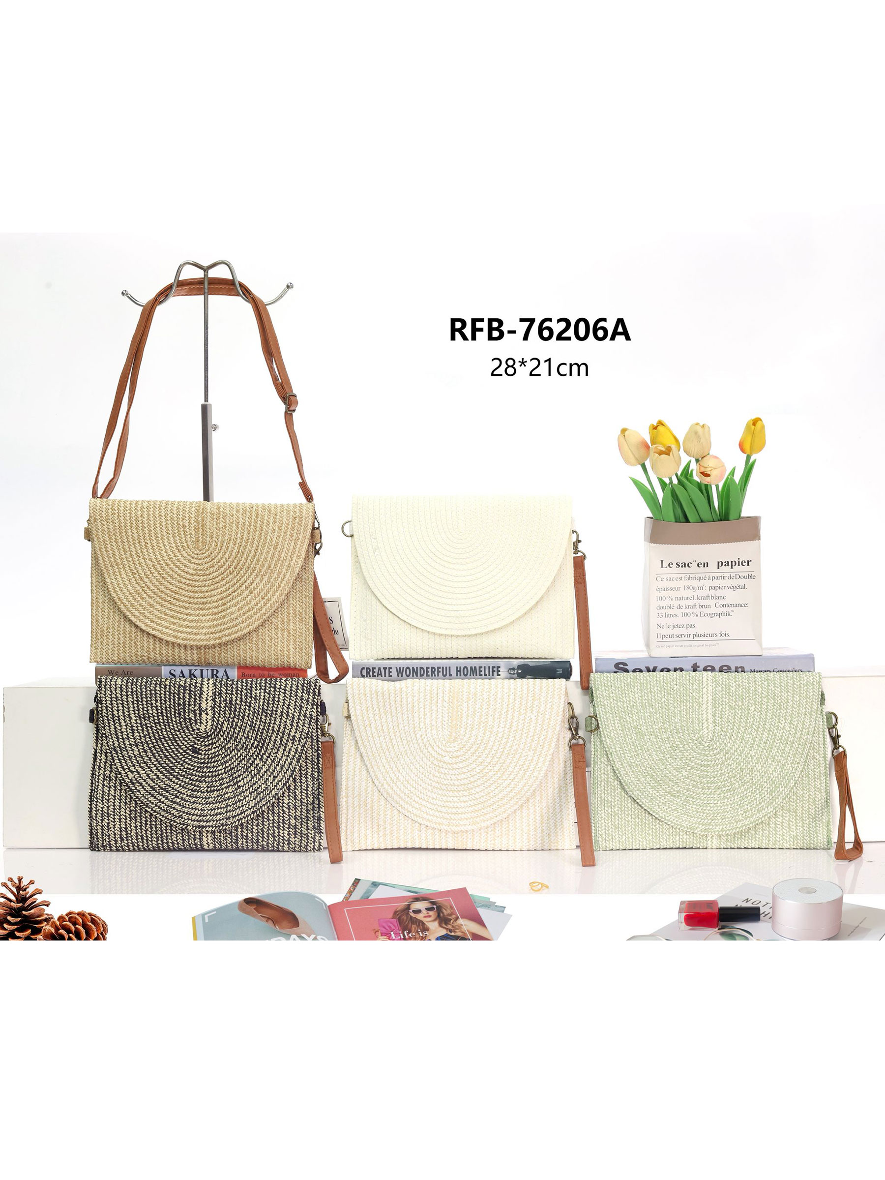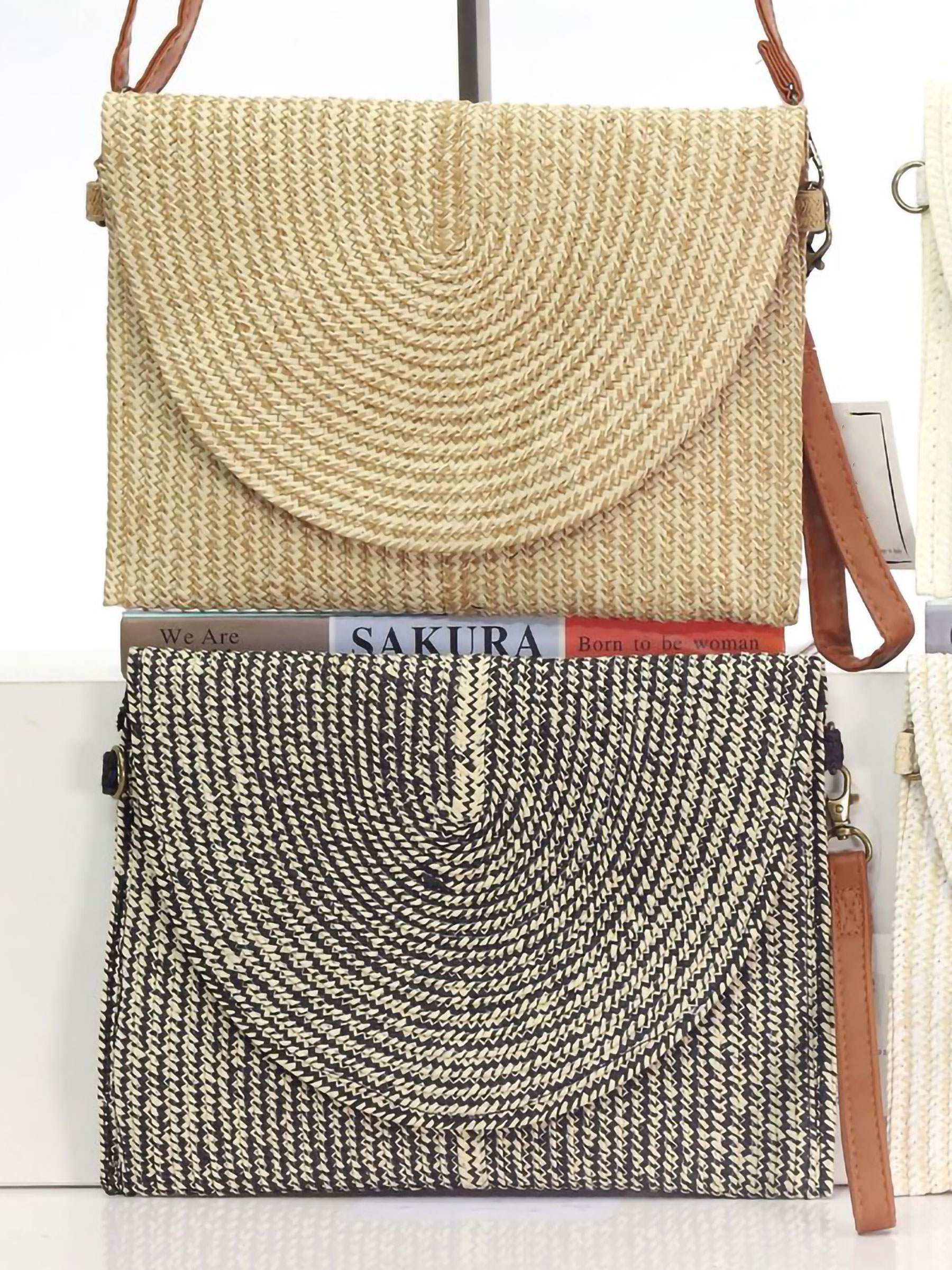 Minimalistische Bast-Umhängetasche mit halbkreisförmiger Klappe.