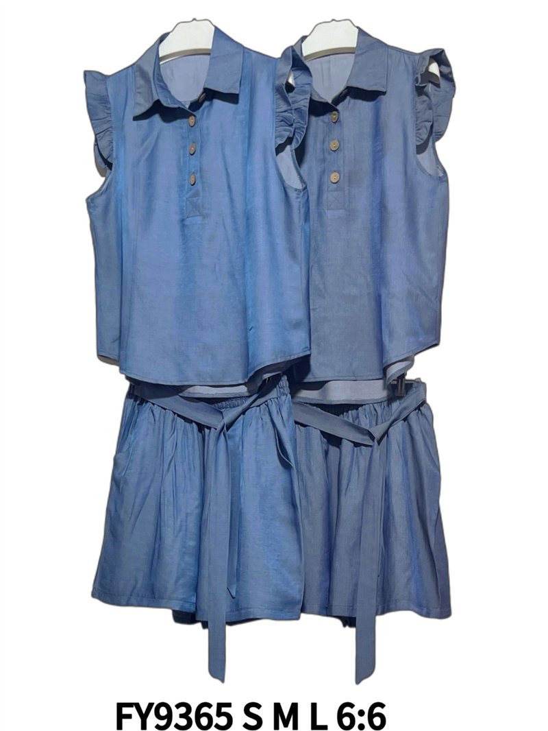 Set aus Bluse in Denim-Optik mit Rüschen und Shorts