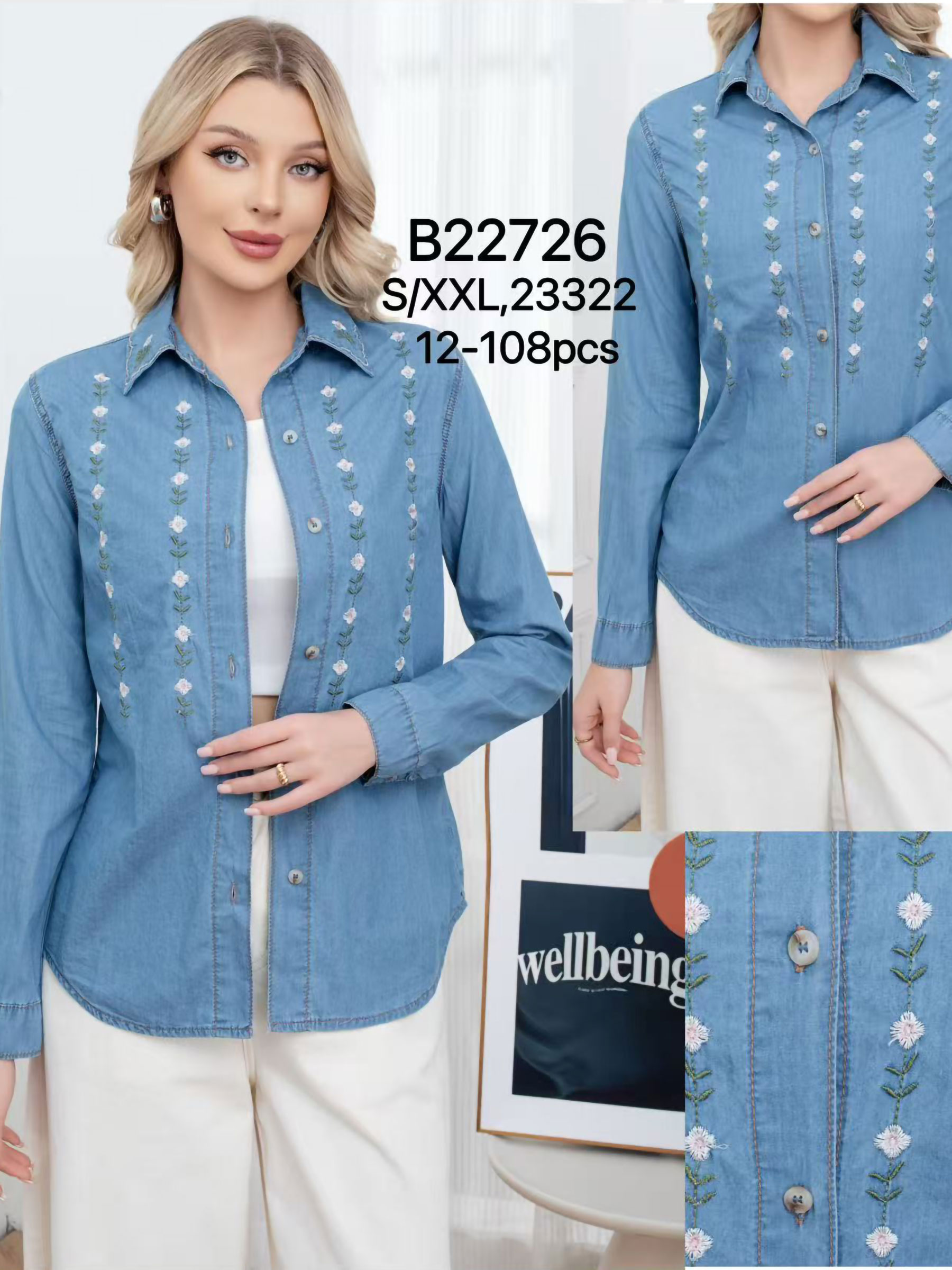 Hemd mit Blumenstickerei. Knopfverschluss und lange Ärmel.