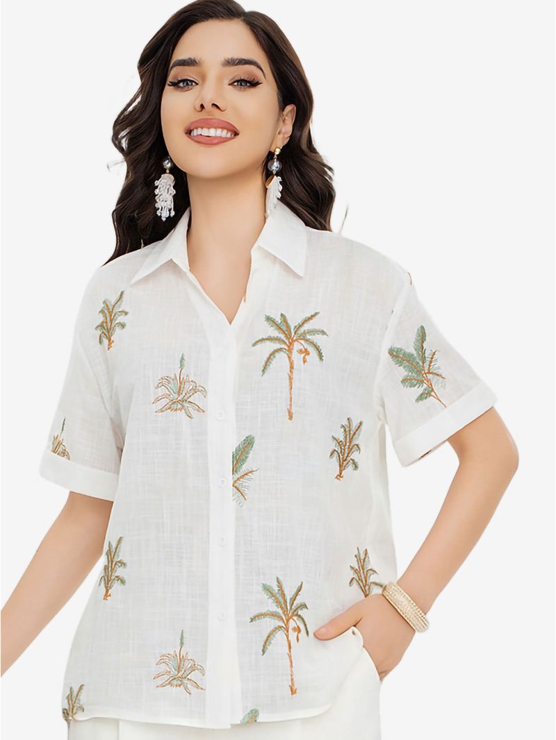 Besticktes Hemd. Palmenmotiv. Reverskragen. Kurze Ärmel. Knopfleiste.