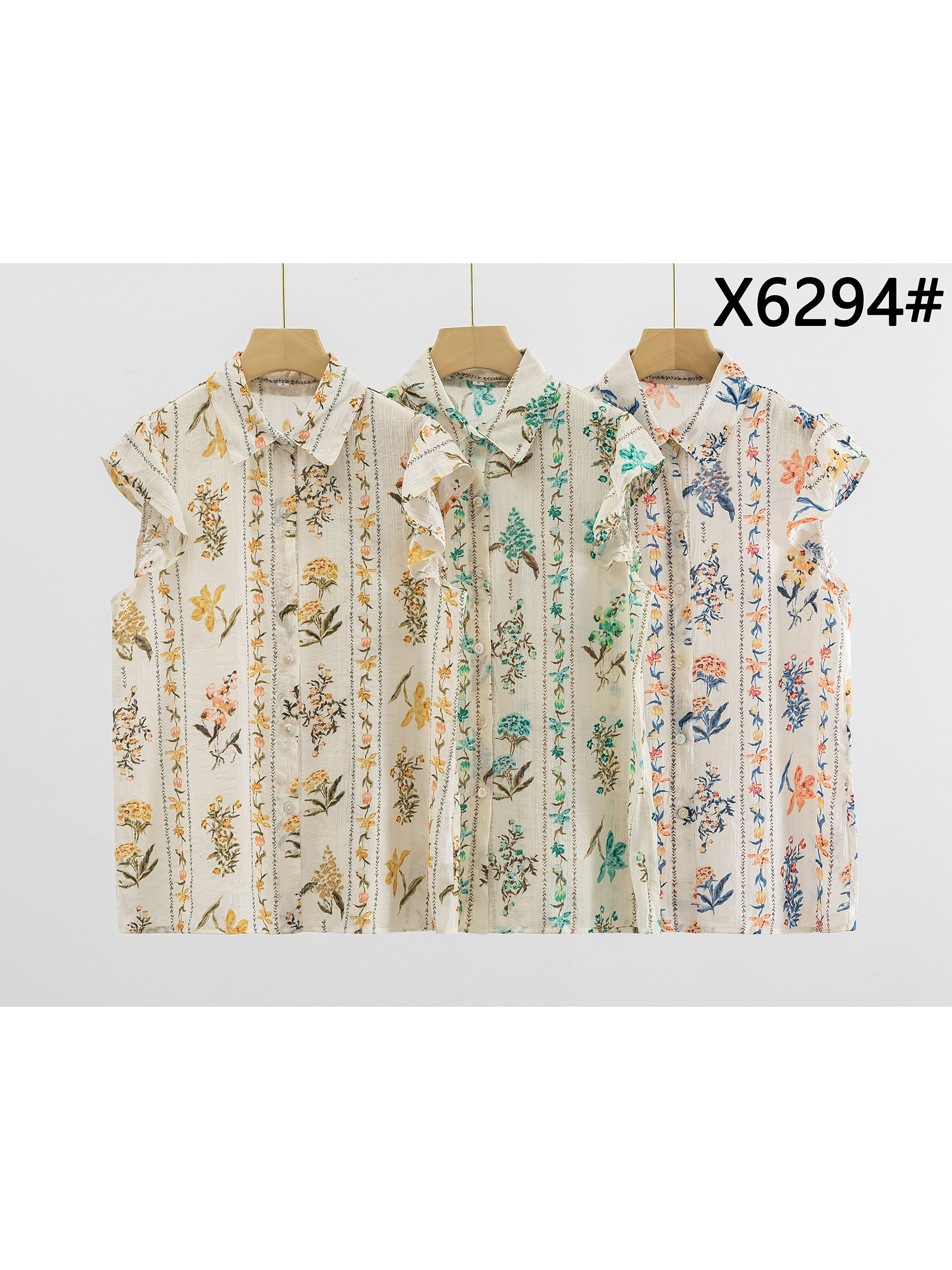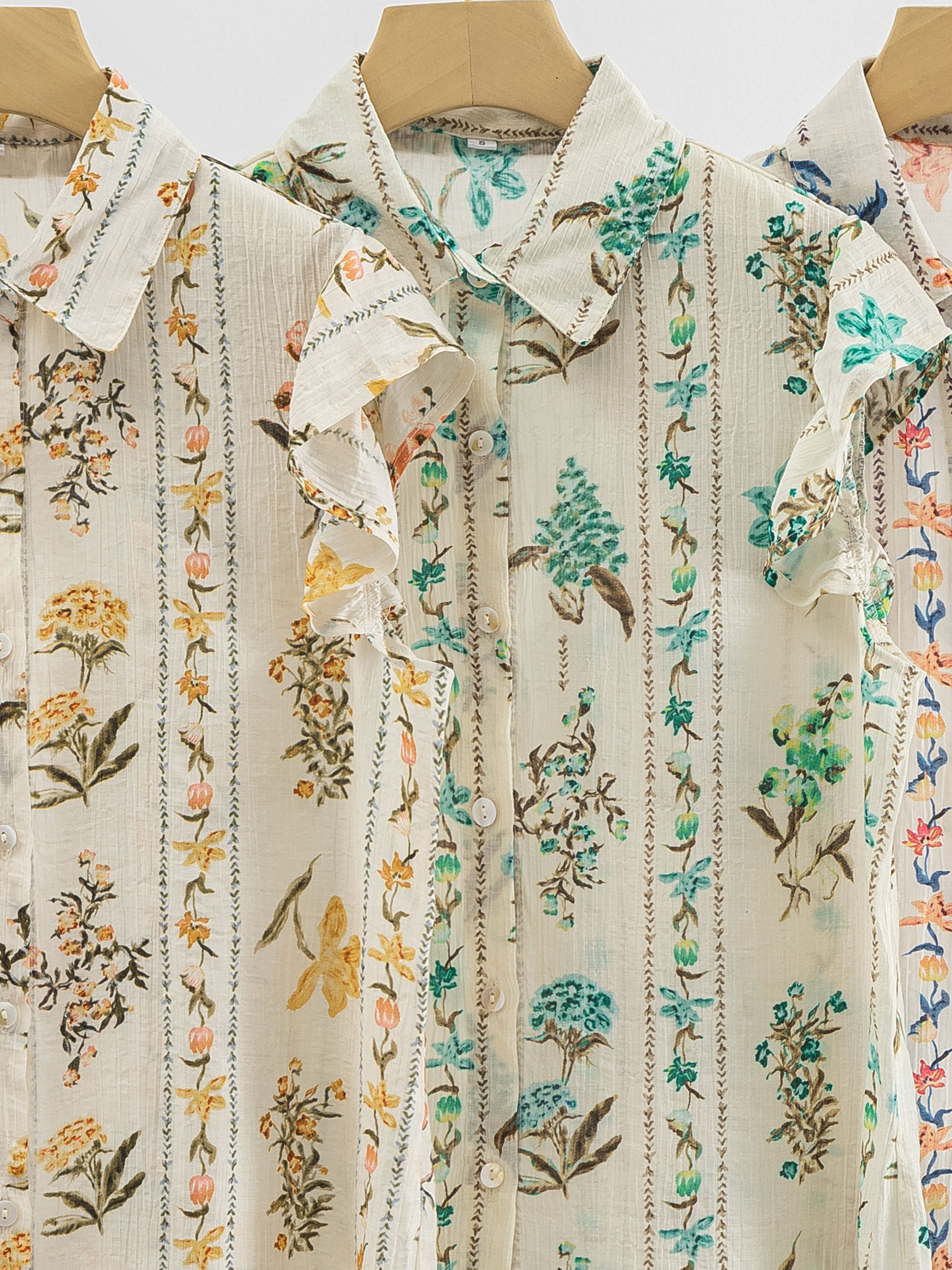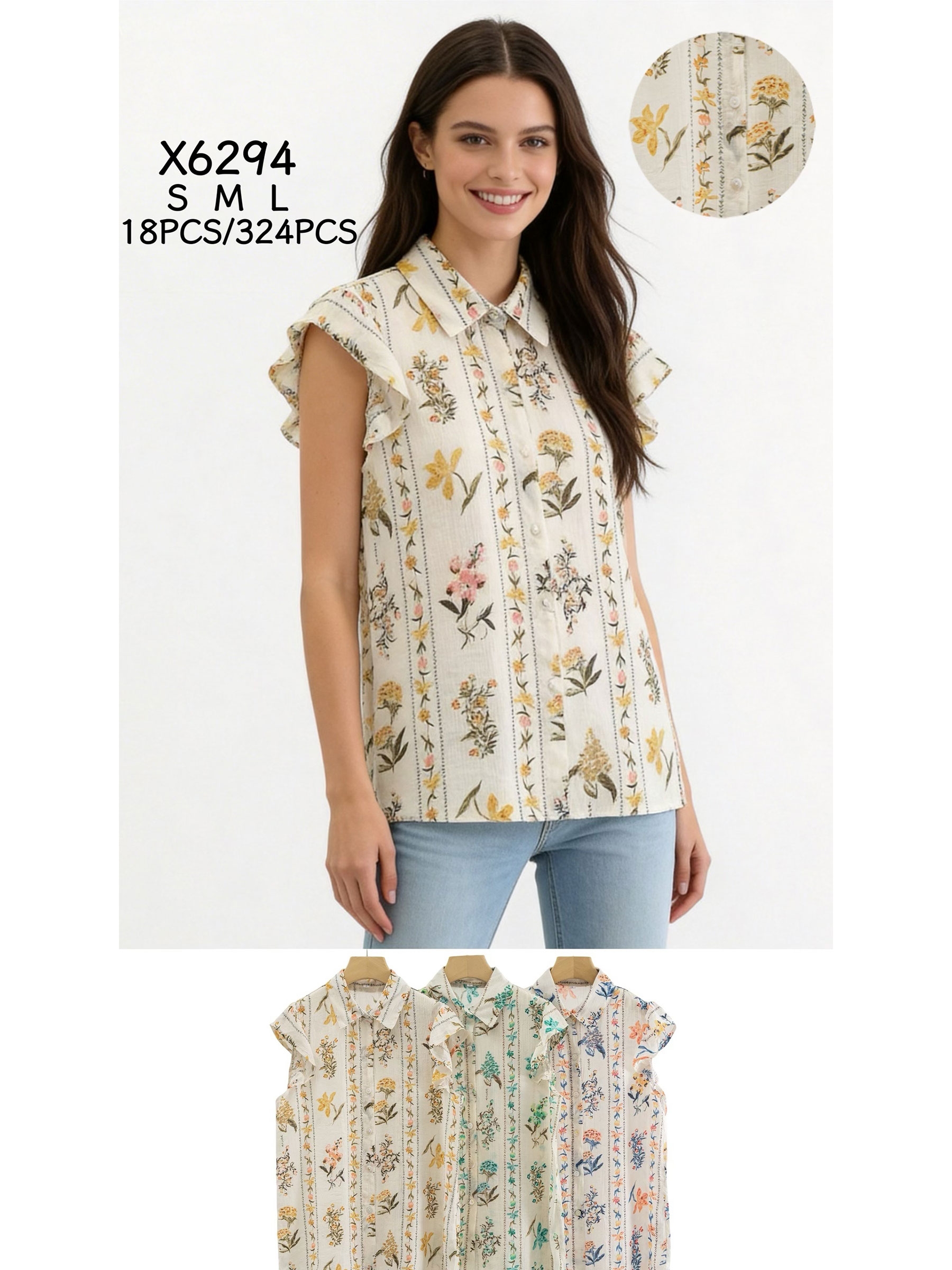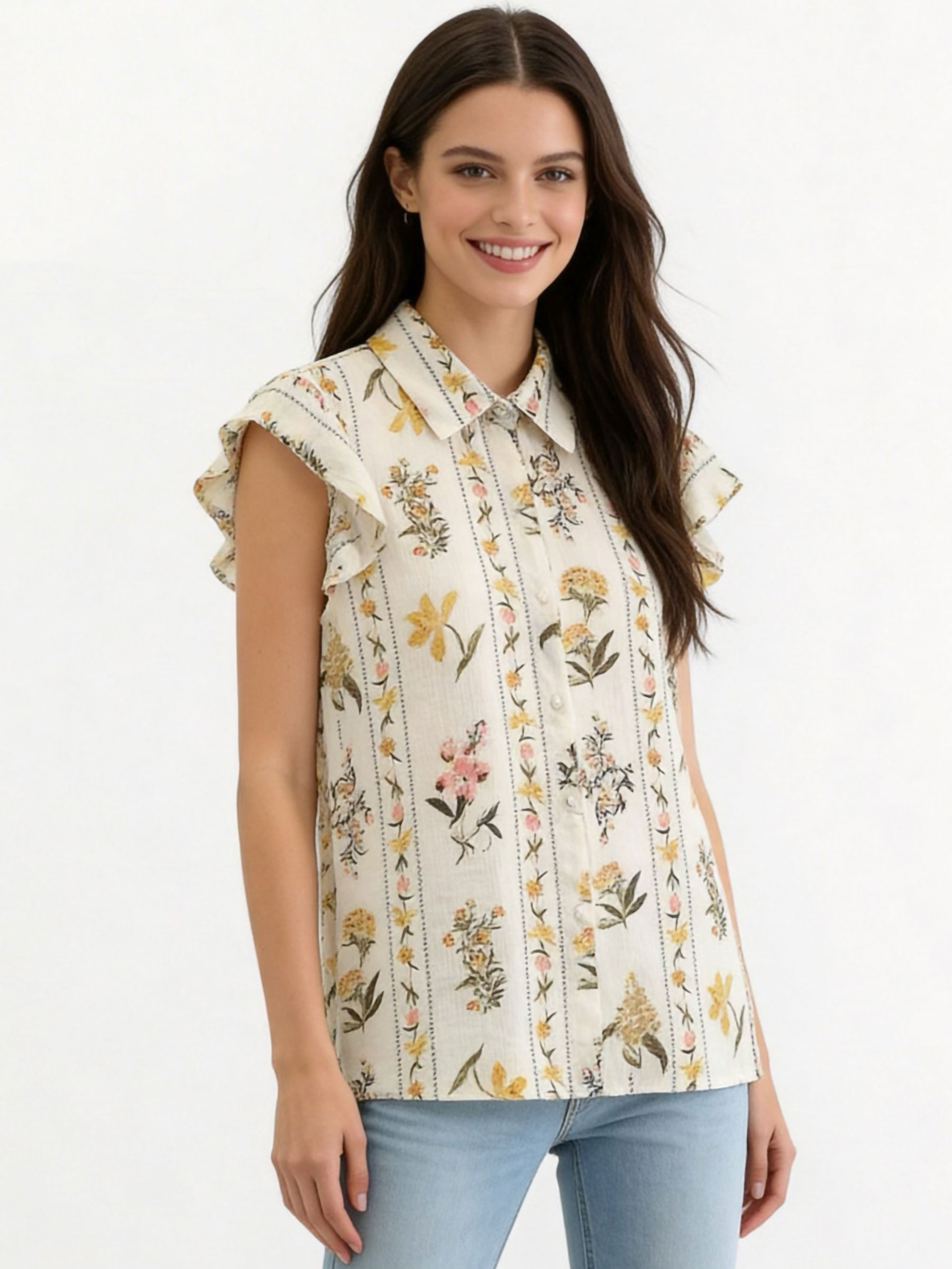 Ärmelloses Blusenhemd mit Blumenmuster, Hemdkragen und Rüschen an den Schultern.