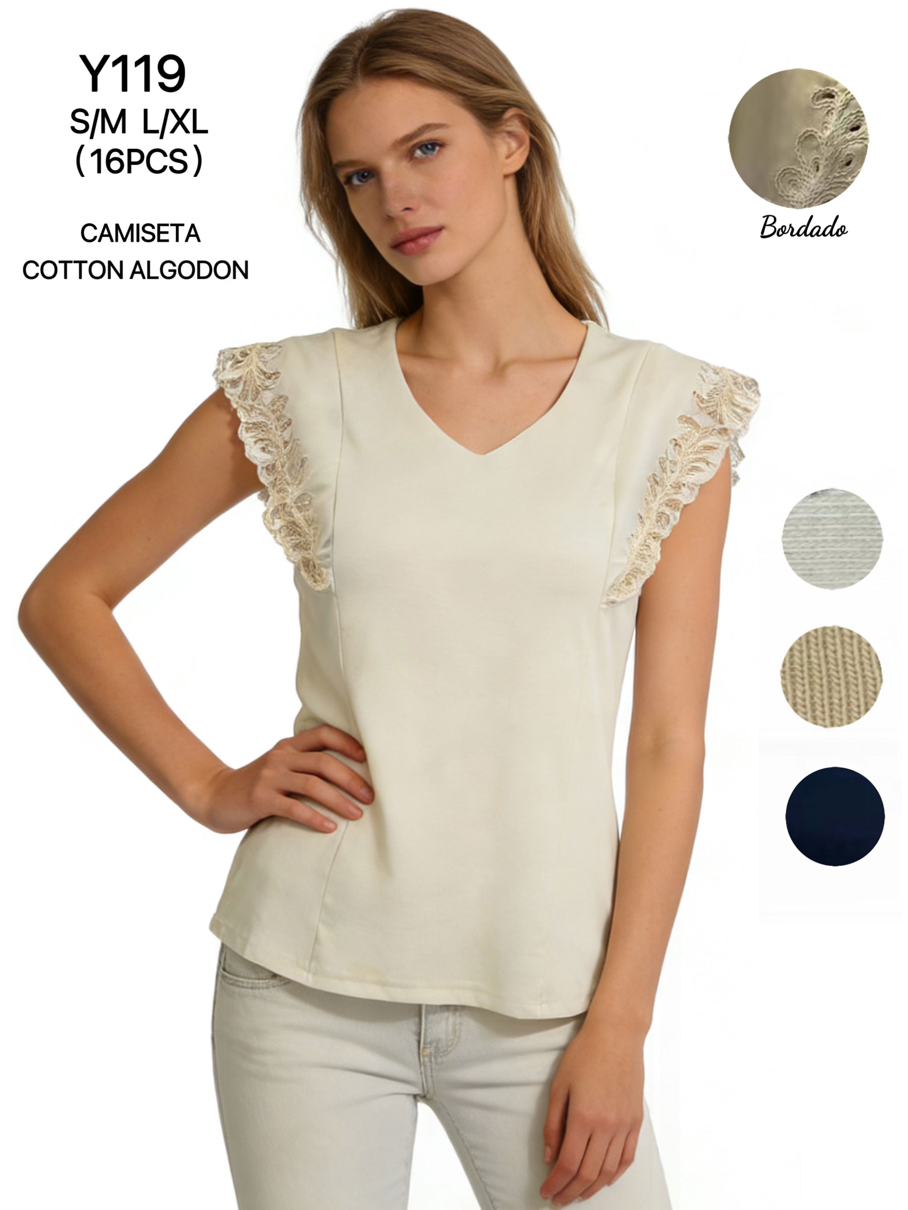 Baumwoll-T-Shirt mit V-Ausschnitt und gestickten Spitzendetails an den Schultern.