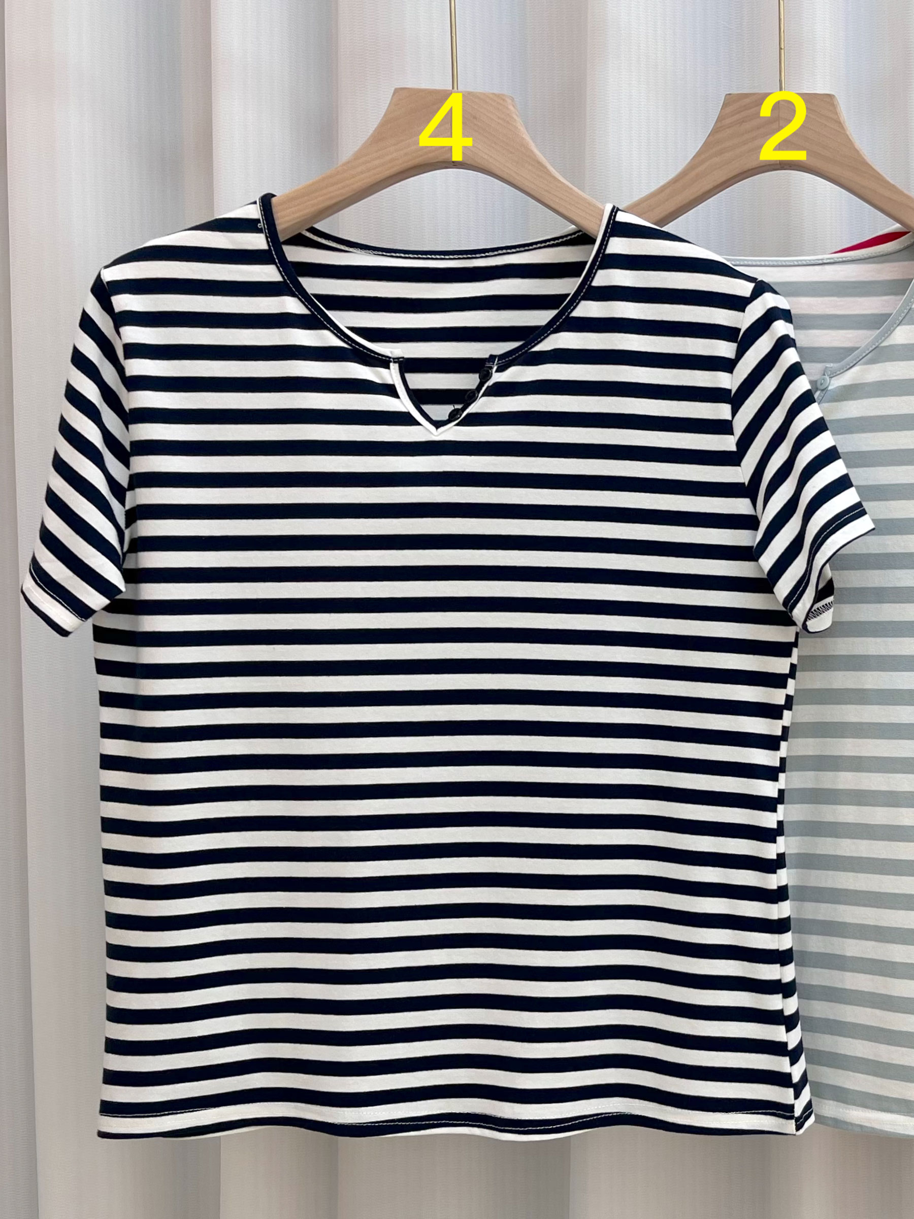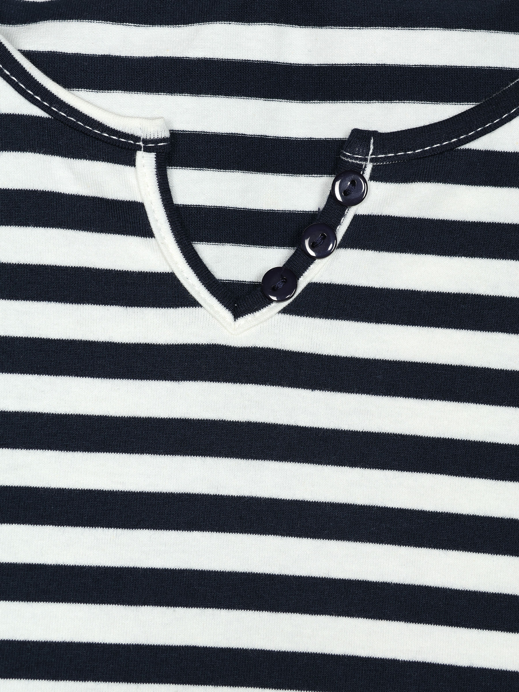 Gestreiftes T-Shirt. V-Ausschnitt mit Knöpfen. Kurze Ärmel. Stretchmaterial.