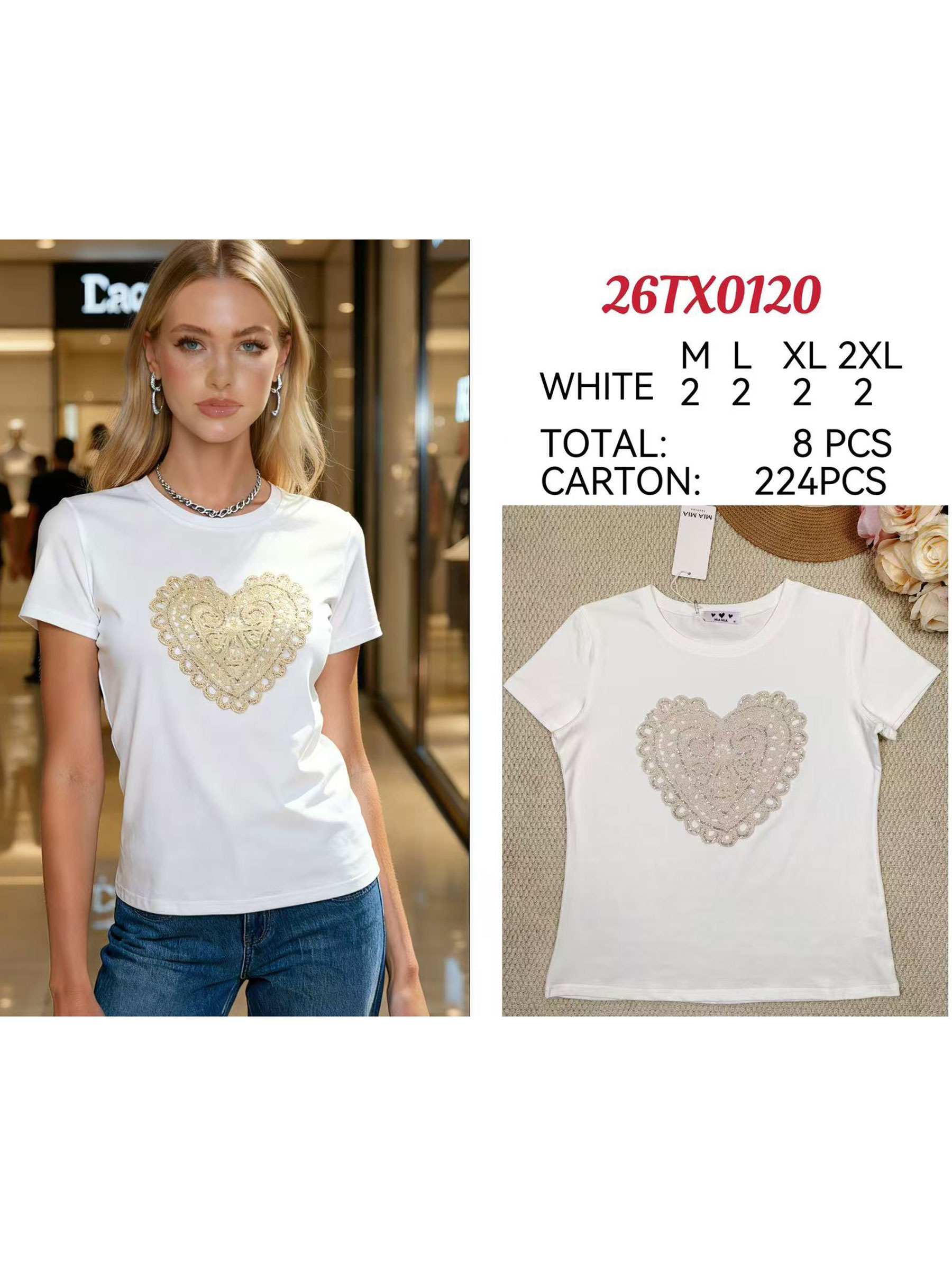 T-Shirt mit Herzapplikation. Glitzernde Stickerei. Rundhalsausschnitt. Kurze Ärmel. Stretchmaterial.