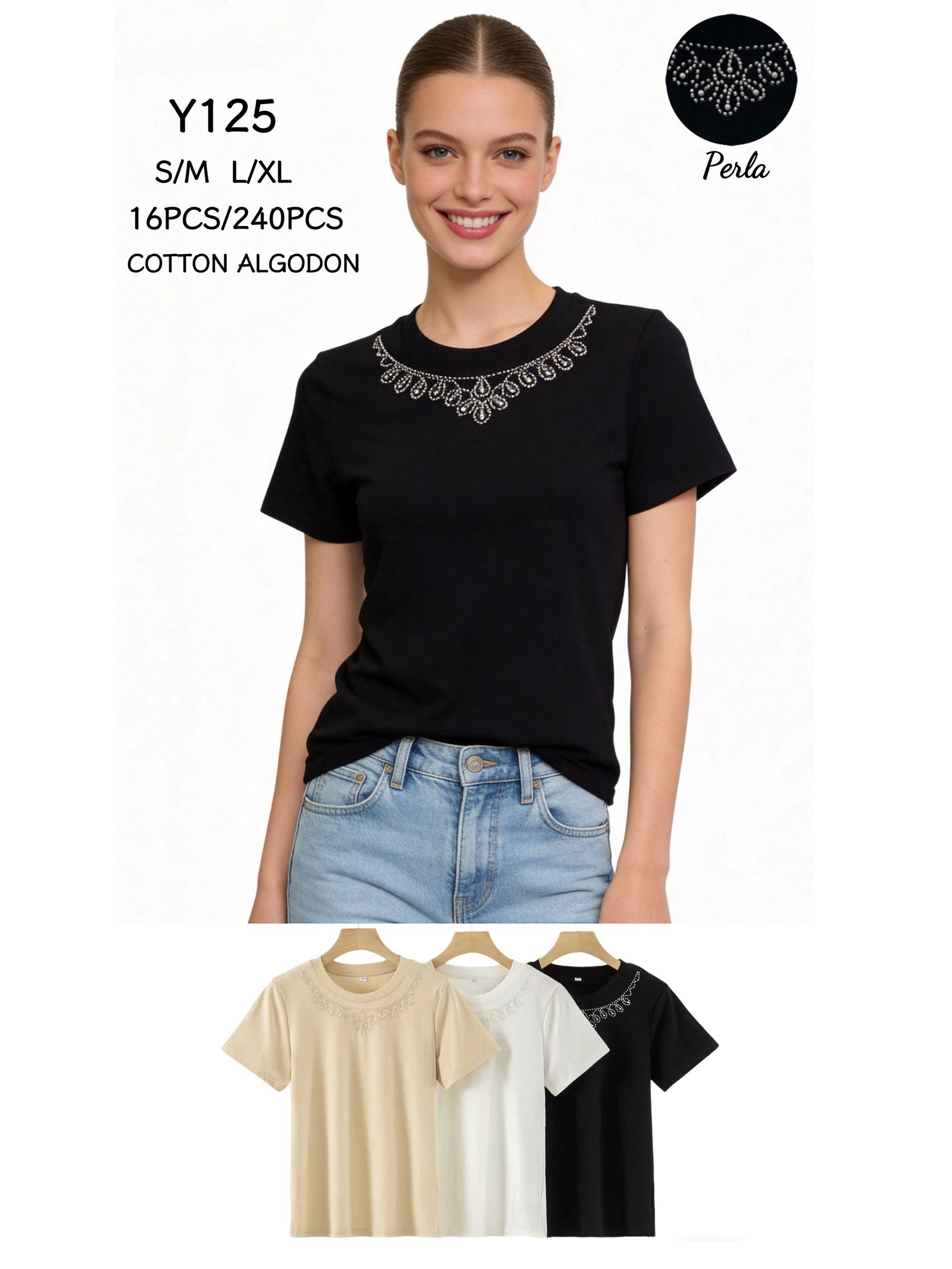 Baumwoll-T-Shirt mit Perlenbesatz am Halsausschnitt.