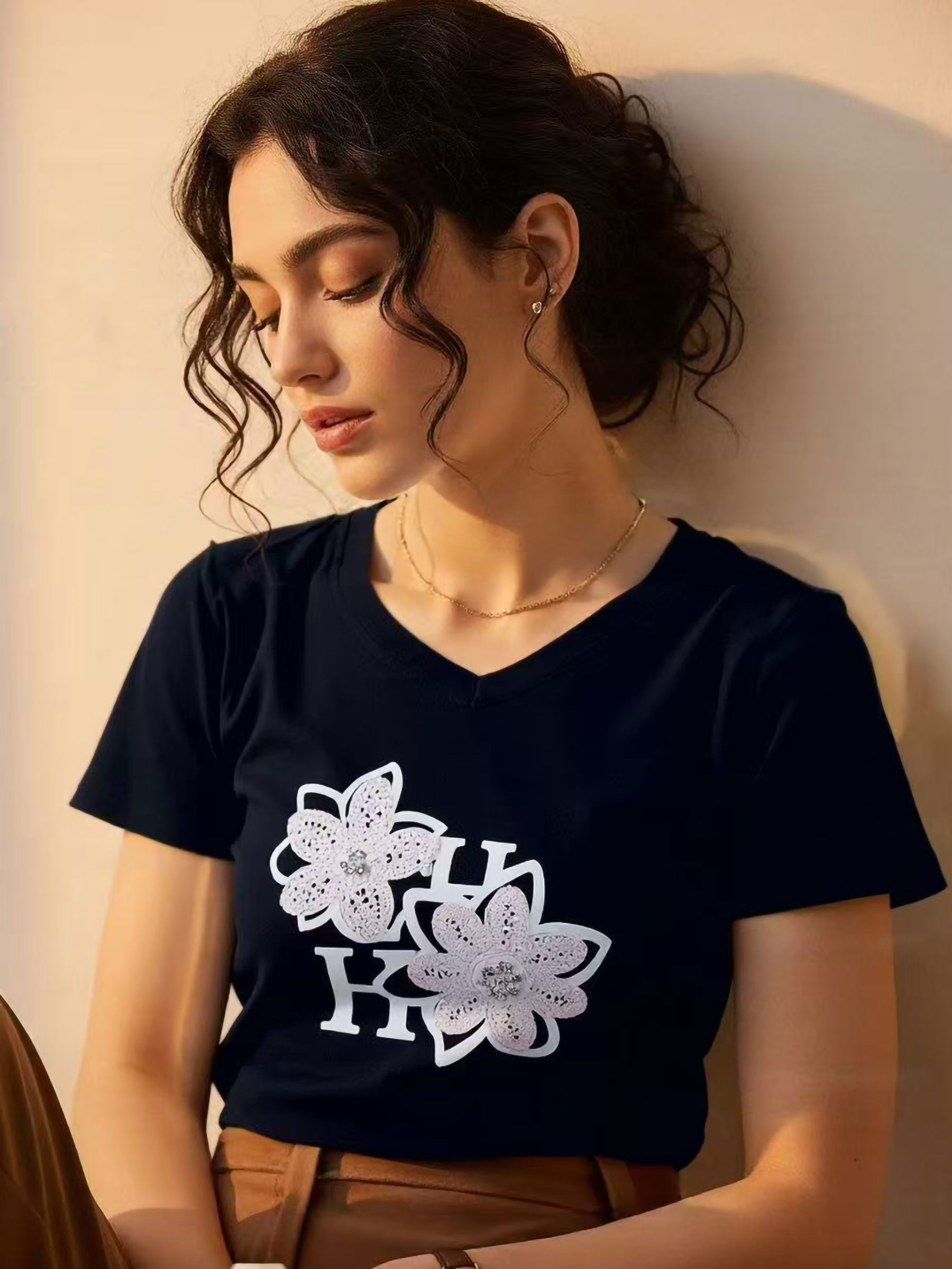 T-Shirt mit Blumenapplikation und Buchstaben.