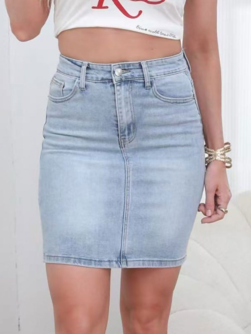 Jeans-Minirock. Fünf Taschen. Schmale Passform. Reißverschluss und Knopfverschluss. Länge 50 cm.