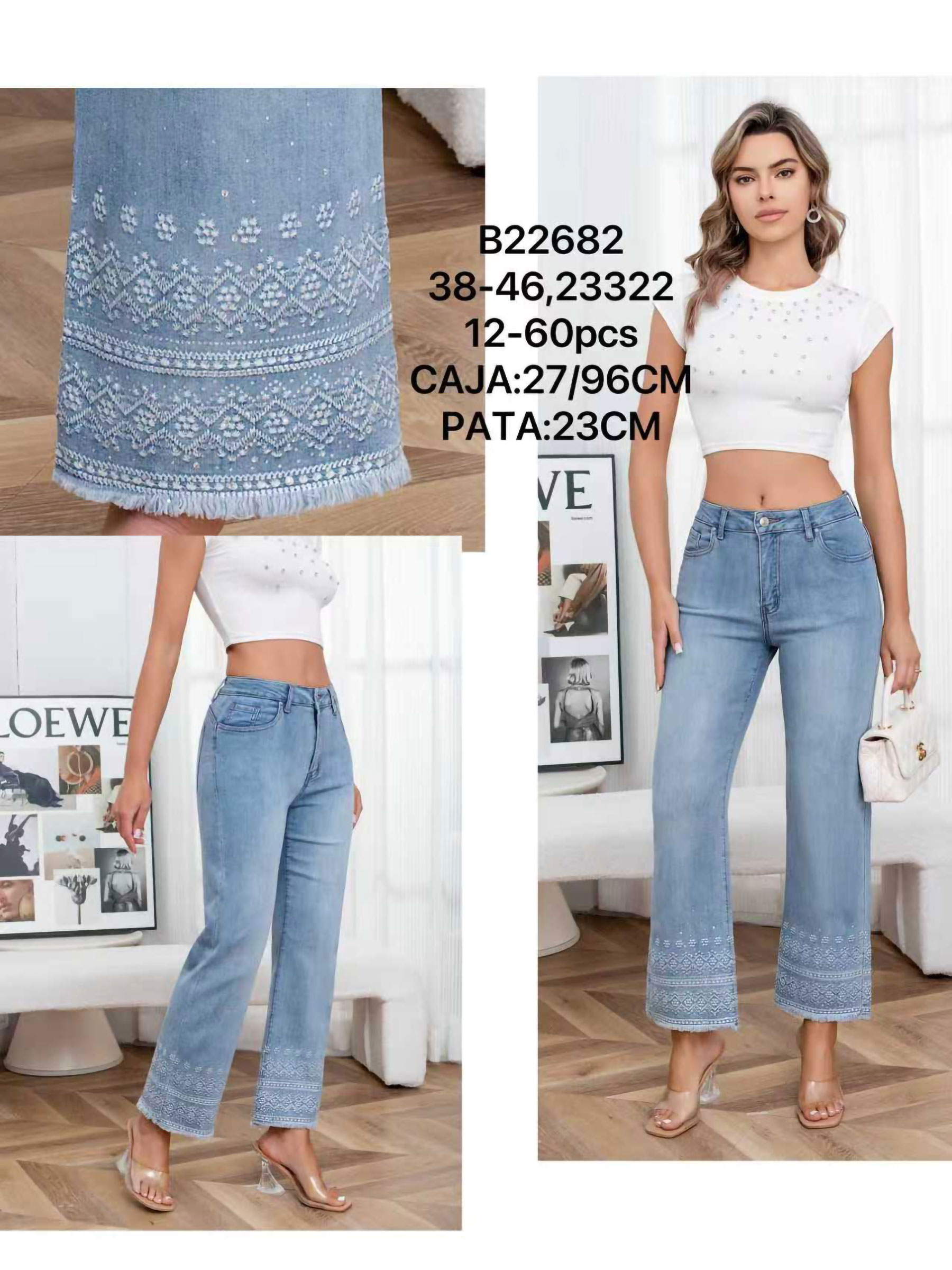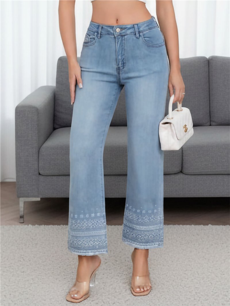 Jeans mit geradem Bein. Geometrische Stickerei am Saum. Hoher Bund. Fünf Taschen. Reißverschluss und Metallknopf vorne. Leibhöhe 27 cm. Länge 96 cm. Saumweite 23 cm.