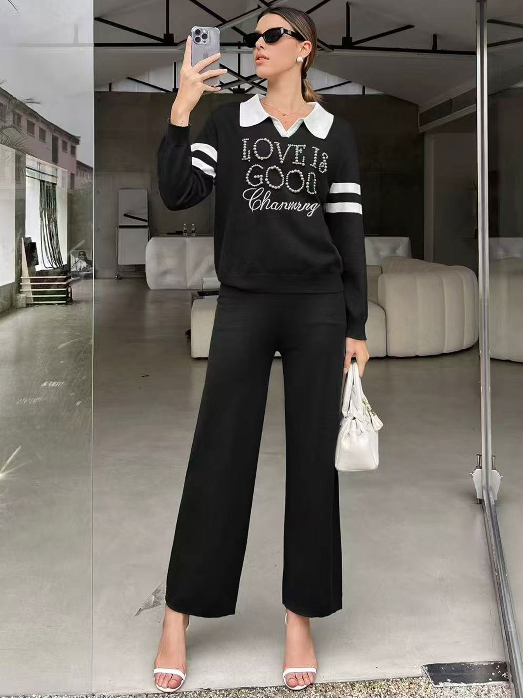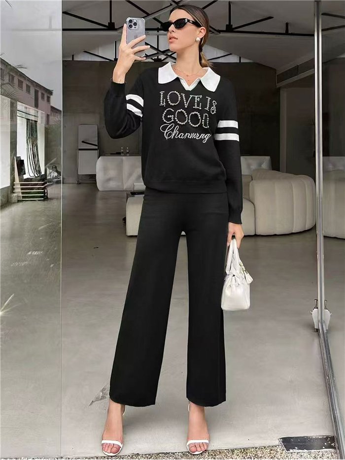 Strickpullover. Perlendetail. Polokragen. Lange Ärmel. Gerade Hose mit elastischem Bund.