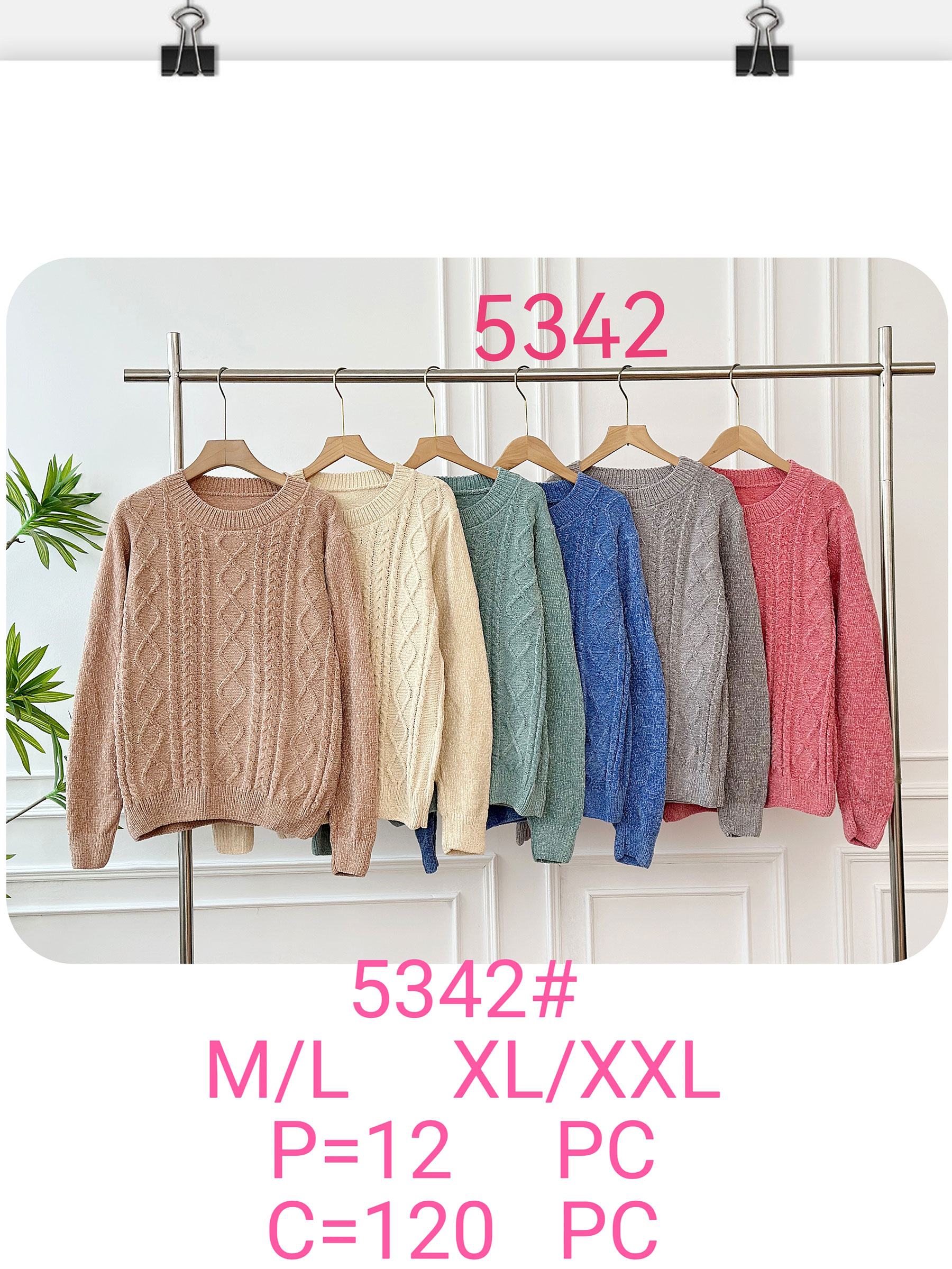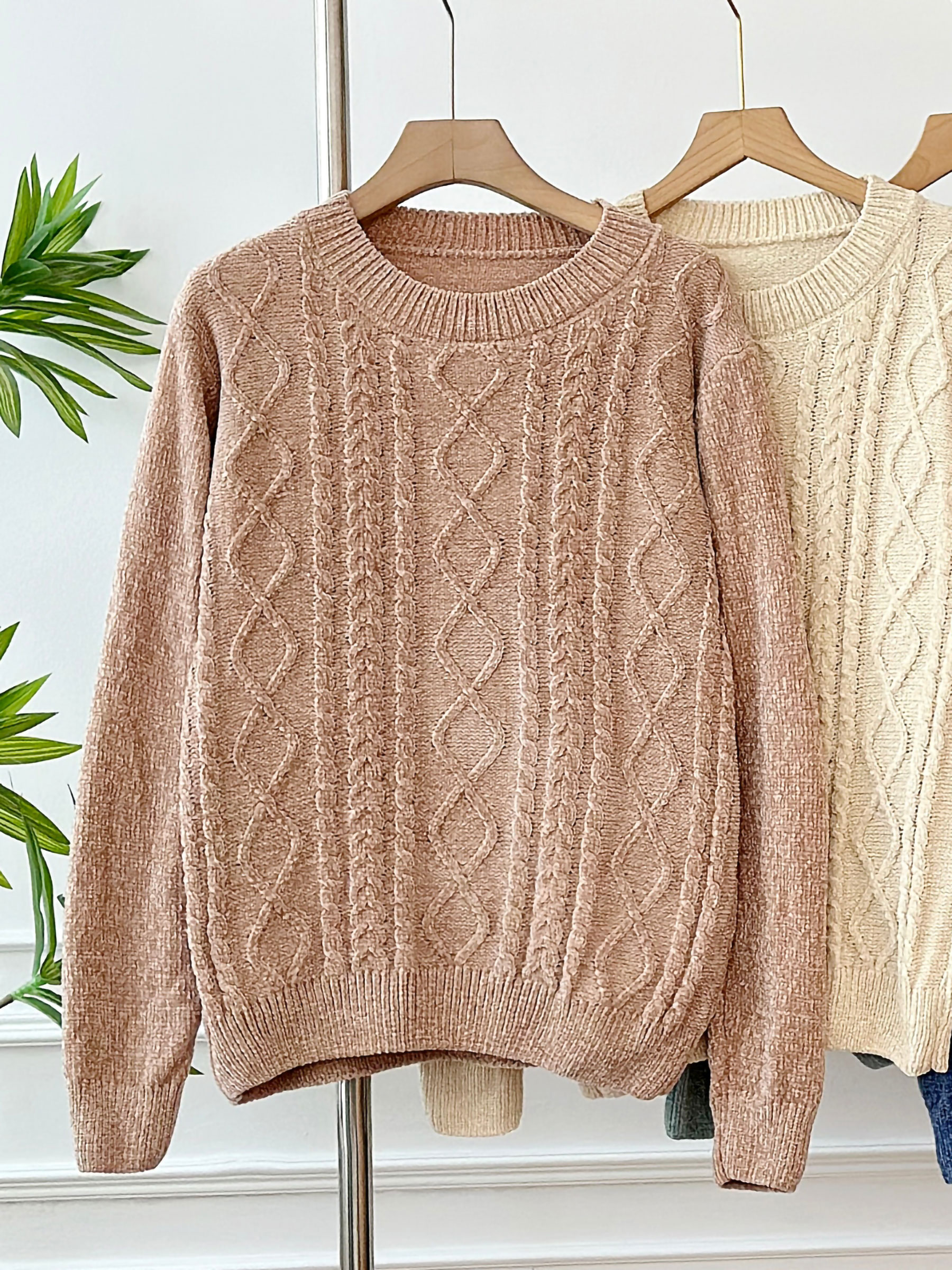 Details des gestrickten Chenille-Pullovers mit Rautenmuster und Rundhalsausschnitt FA-5342