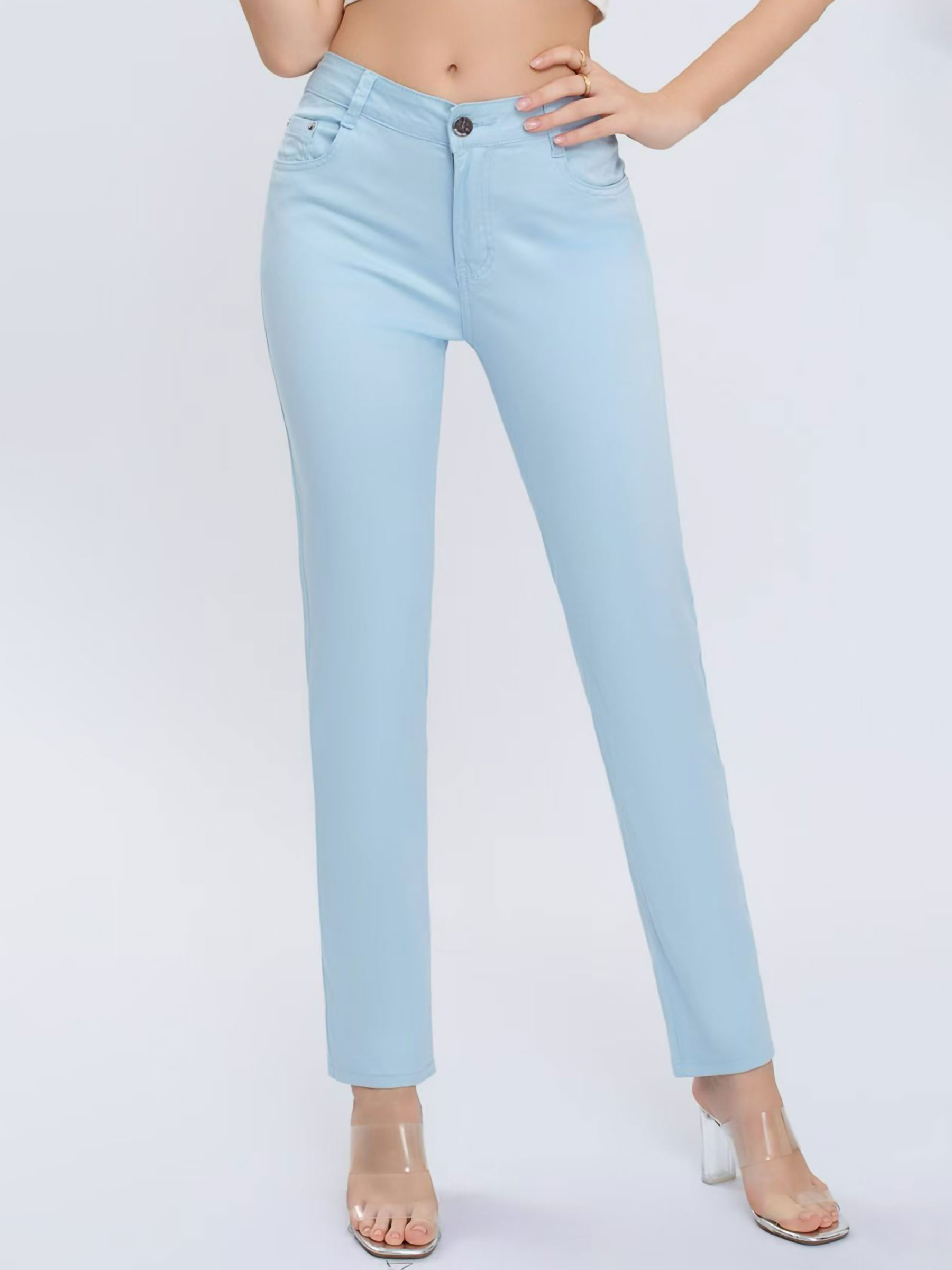 Elastische Hose. Hochgeschnitten. Fünf Taschen. Reißverschluss und Knopfverschluss vorne.