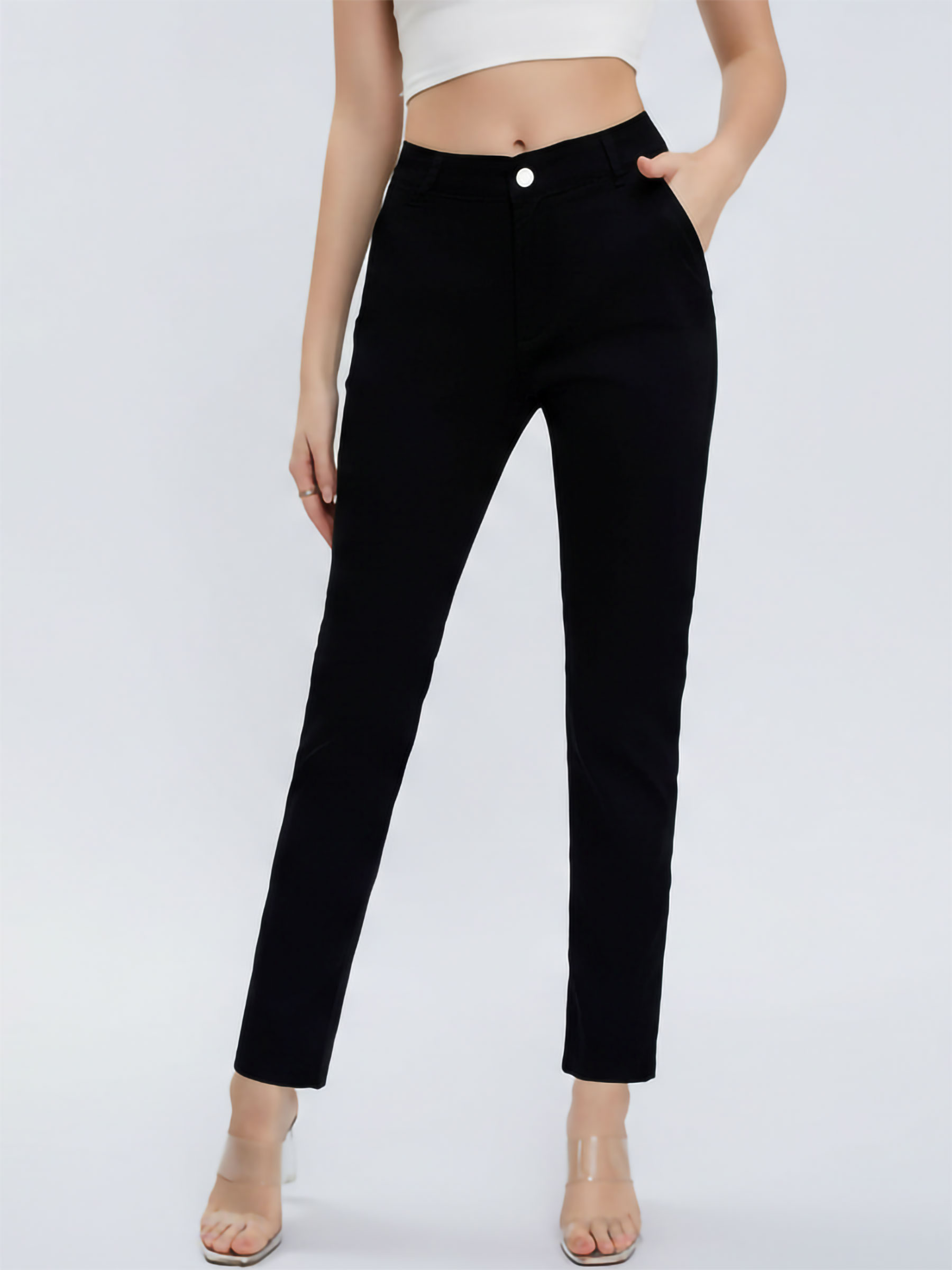 Hose mit elastischem Bund. Hoher Bund. Seitentaschen. Reißverschluss und Knopfverschluss vorne.