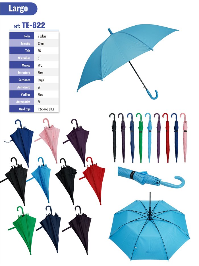 Regenschirm 55 cm lang aus PG-Stoff mit 8 Fiberglasstreben, automatischer Öffnung und winddichter Struktur. Griff aus PVC-Haken.
