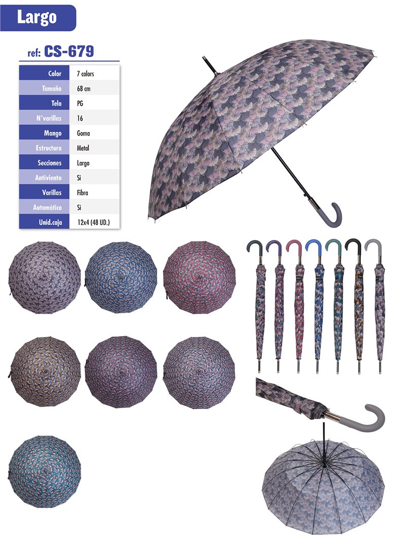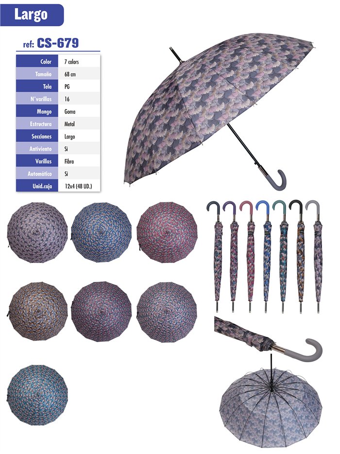Automatischer langer Regenschirm mit Multicolor-Druck. 68 cm Kuppel aus PG-Gewebe, 16 Fiberglasstreben und Metallstruktur. Windbeständig und mit Gummigriff.