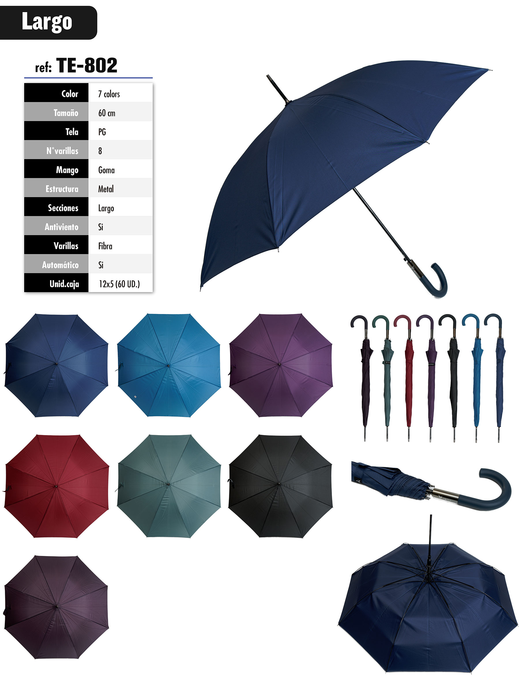 Automatischer langer Regenschirm in einfarbigem Design. Fiberglasstreben und windfeste Metallstruktur, Gummigriff und PG-Stoff.