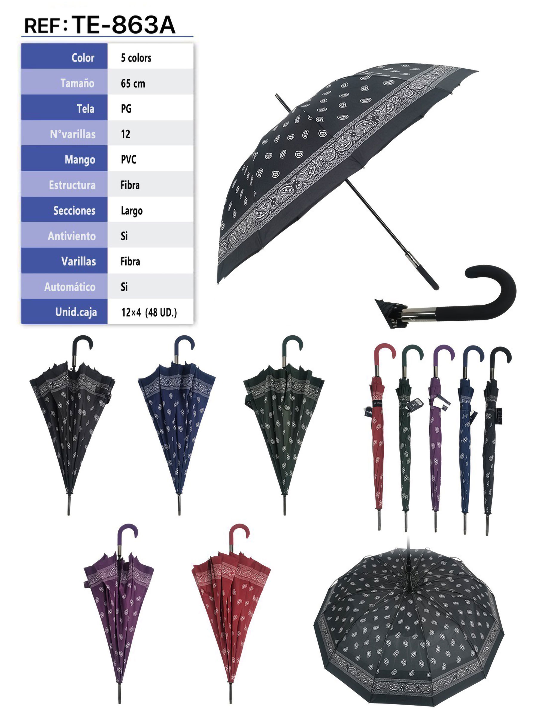 Automatischer langer Regenschirm mit Druck. 12 Fiberglasstreben und Fiberglasstruktur mit PVC-Griff und Windschutzsystem.
