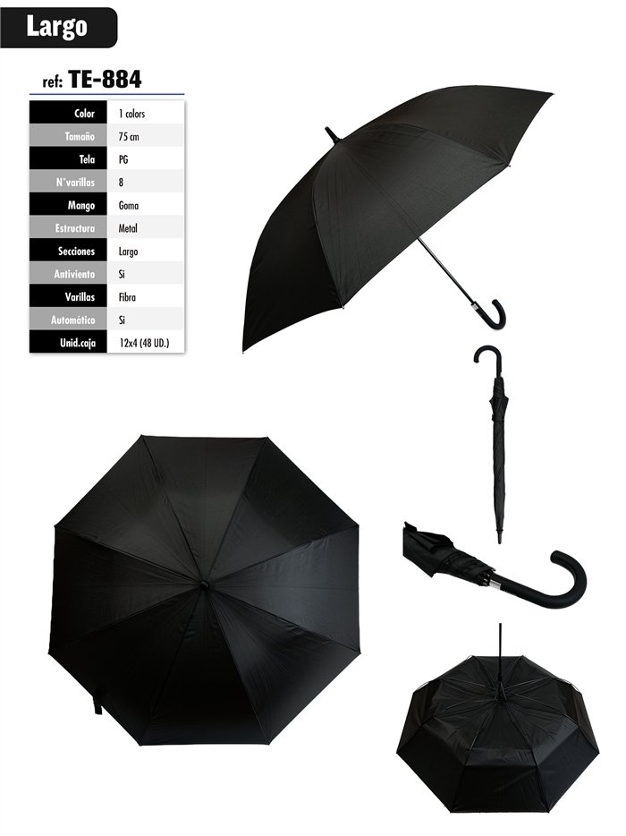 Regenschirm in Schwarz mit automatischem Öffnungsmechanismus und gebogener Griff. 8 Fiberglasstreben, Metallstruktur, PG-Gewebe und Windschutzsystem.