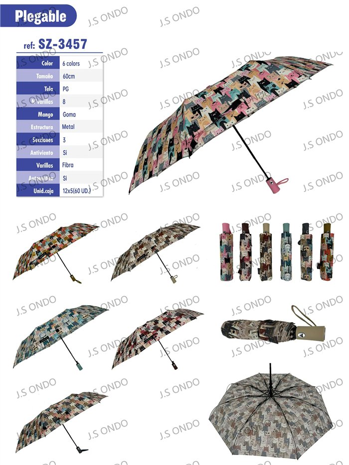 Regenschirm mit automatischem Klappmechanismus, 3-teilig mit 8 Fiberglasstreben und Metallstruktur. PG-Gewebe mit Katzenmuster. Winddichtes System und Gummigriff.