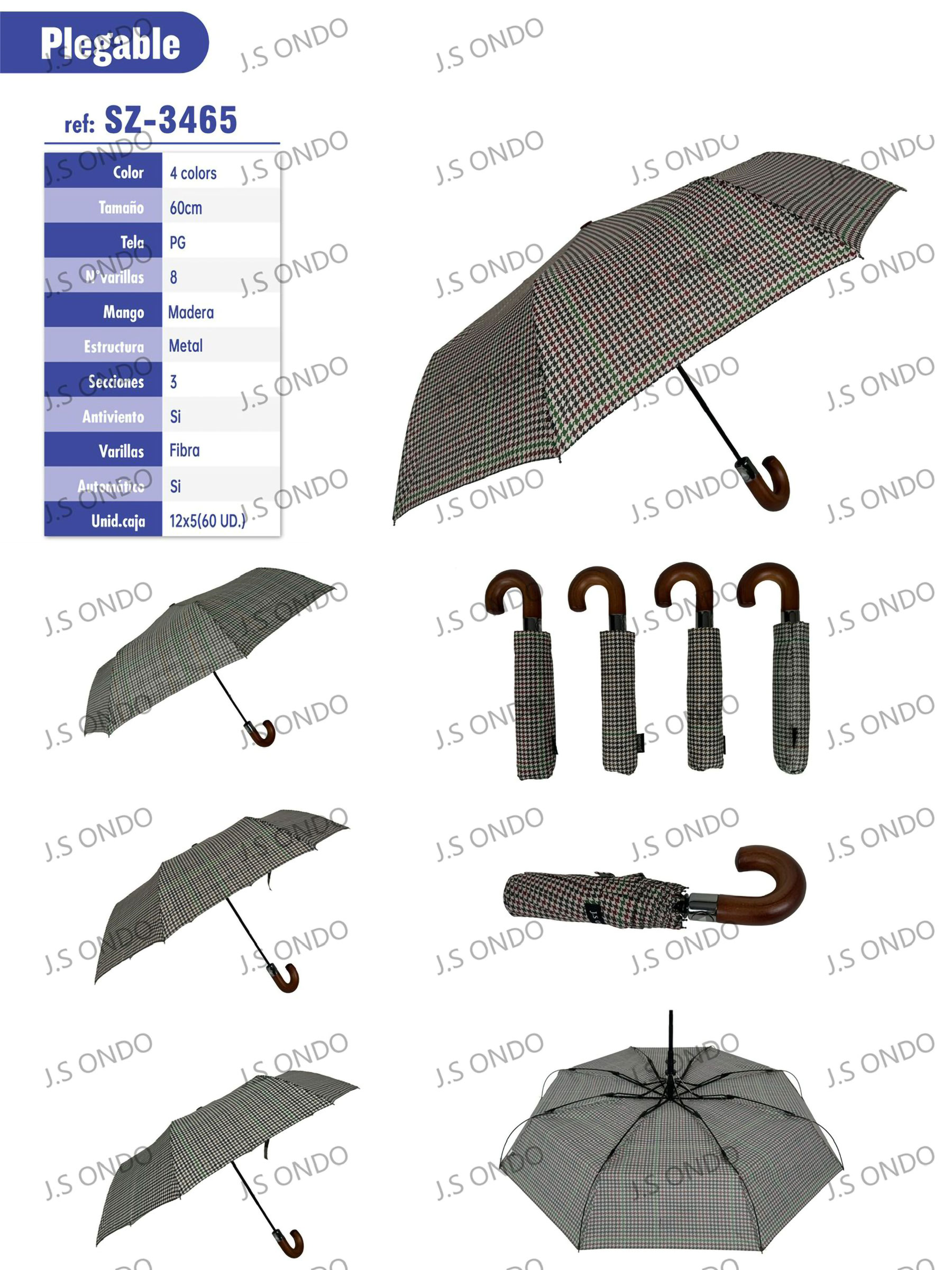 Automatischer faltbarer Regenschirm mit 3 Abschnitten, 8 Fiberglasstreben und Metallstruktur. PG-Gewebe mit Mikrokaros und Holzeffektgriff. Windschutzsystem.