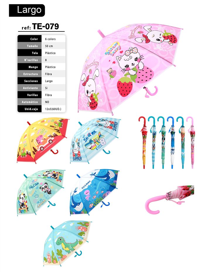 Langschirm transparent mit 8 Fiberglasstreben und Fiberglasstruktur. Kindermotive mit Bären, Pandas und Meeresmotiven. Windbeständig und Kunststoffgriff.