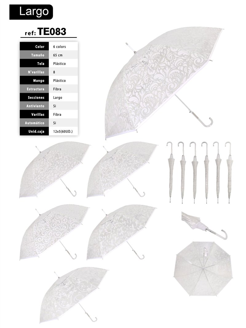 Regenschirm lang transparent mit automatischer Öffnung. Fiberglasstruktur und 8 Streben. Arabeskes Muster in Weiß. Windbeständig und Kunststoffgriff.