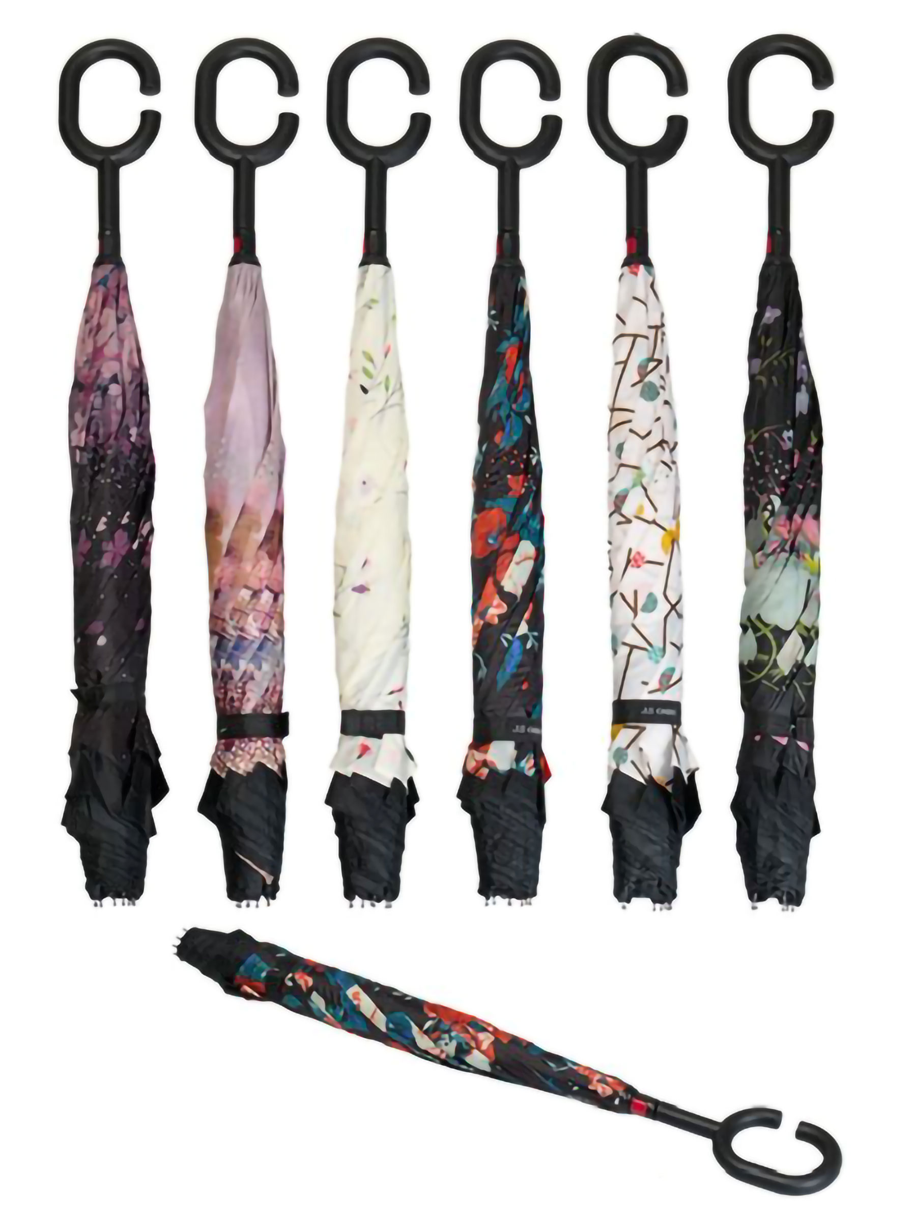 Langer Regenschirm mit Blumenmuster. Robustes Gewebe mit Windproof-System, Fiberglasstreben und Metallstruktur. Bequemer Gummigriff. 6 verschiedene Designs.