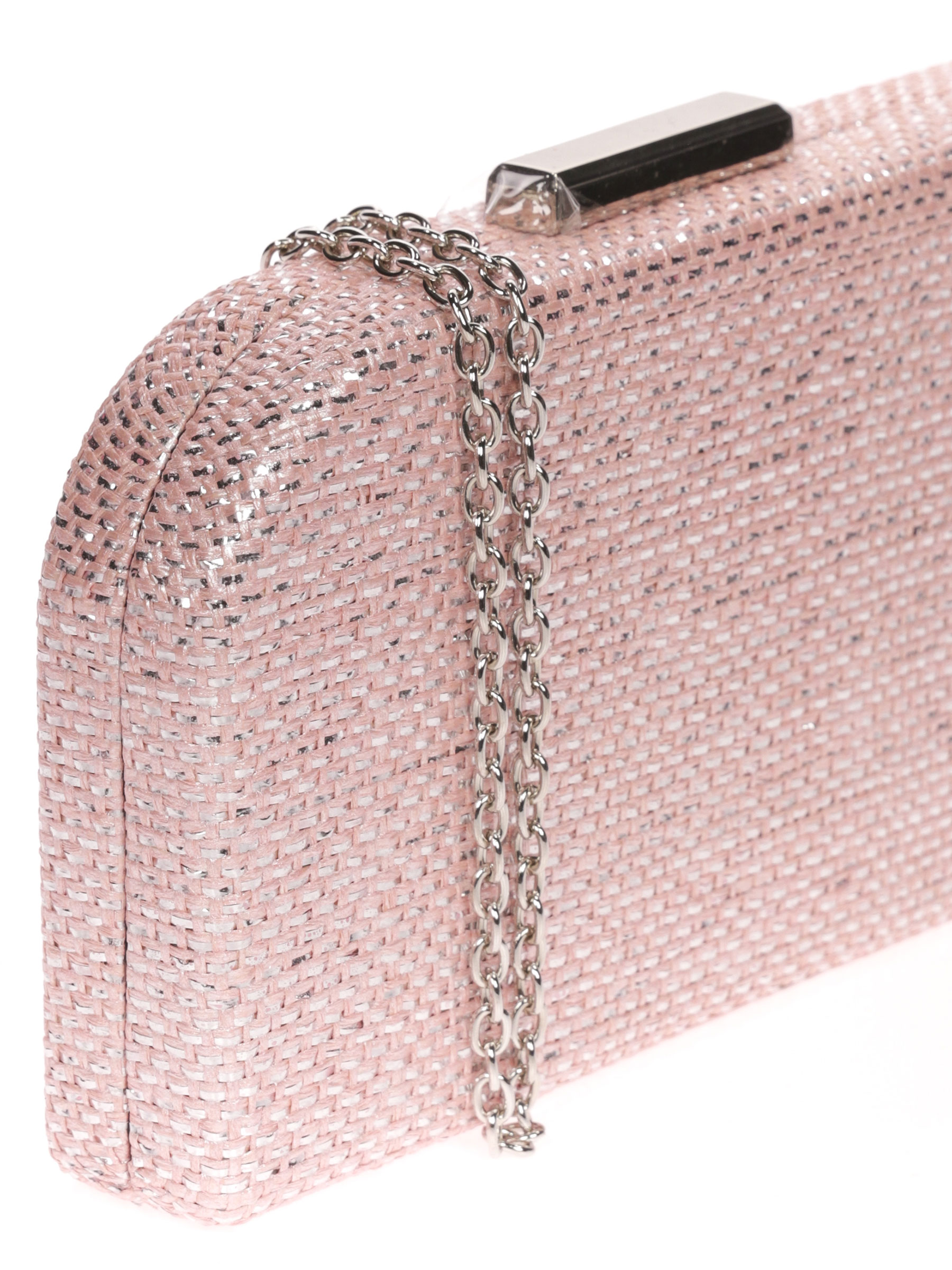 Partytasche. Material: Raffia. Metallischer Effekt. Schulterriemen aus Kette. Futter ohne Innentasche. Silberner Metallverschluss.