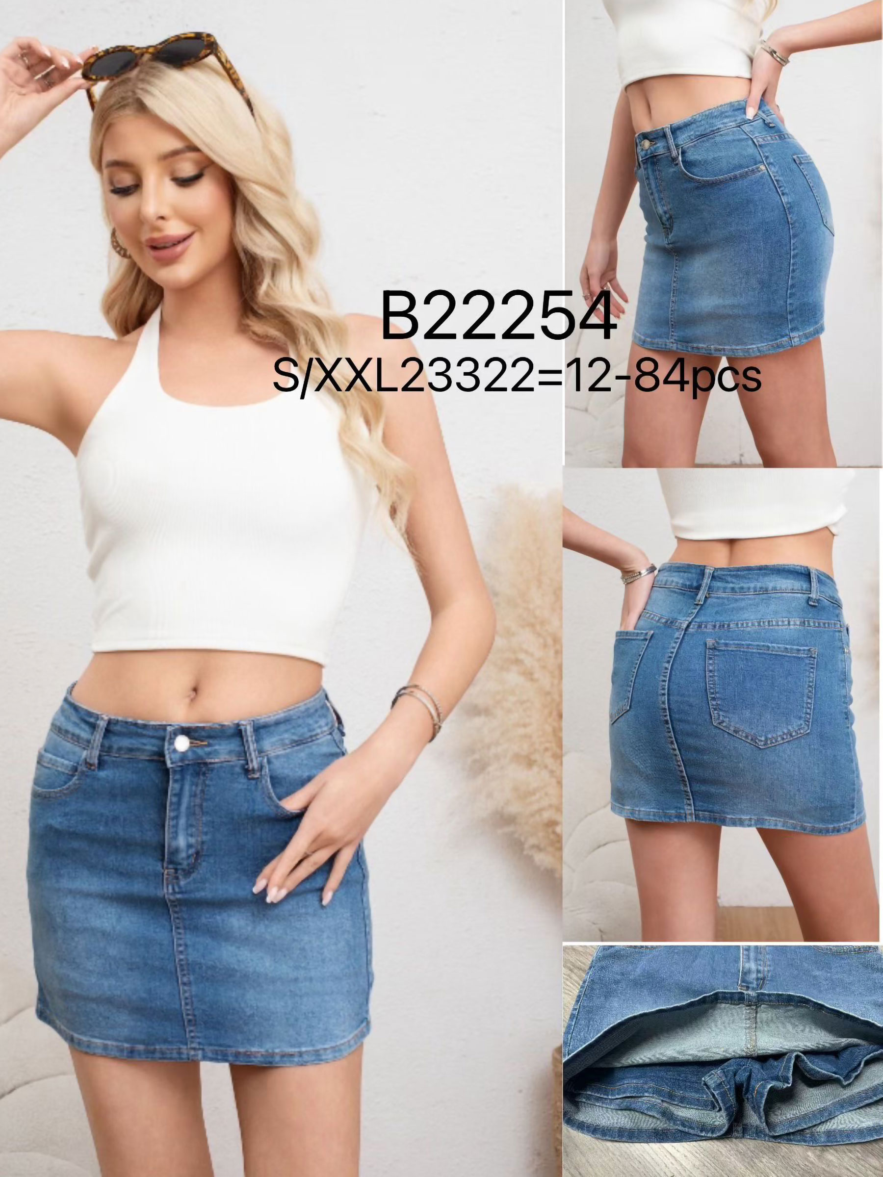 Jeansrock. Hohe Taille. Fünf Taschen. Reißverschluss und Knopfverschluss.