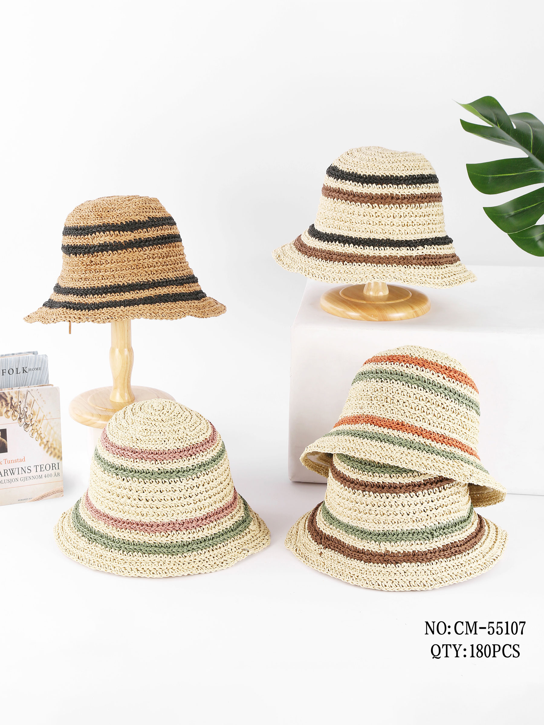 Bast-Bucket-Hat mit Streifen in Erdtönen