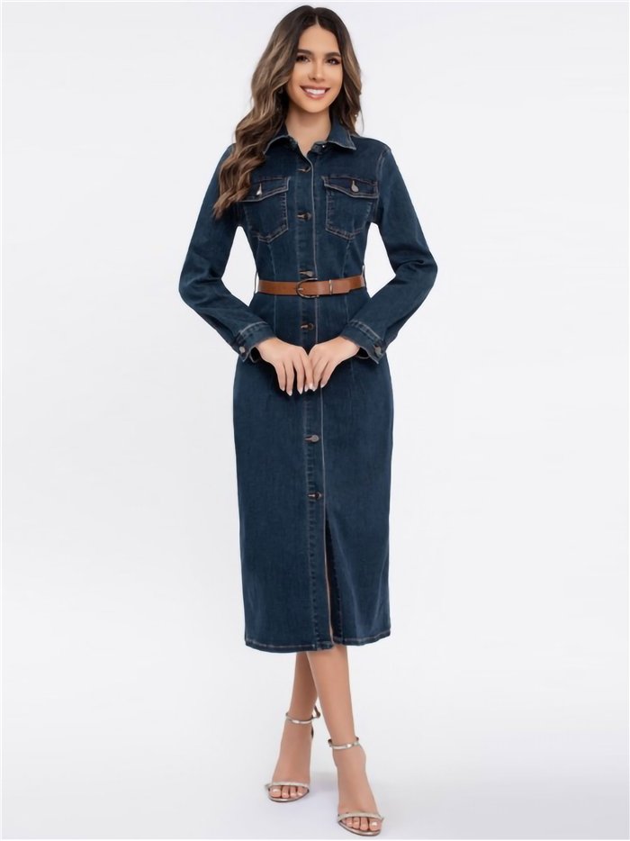 Langes Denim-Kleid. Elastischer Stoff. Kontrastierender Gürteldetail. Zwei aufgesetzte Taschen mit Klappen auf der Brust. Reverskragen. Lange Ärmel. Knopfverschluss.