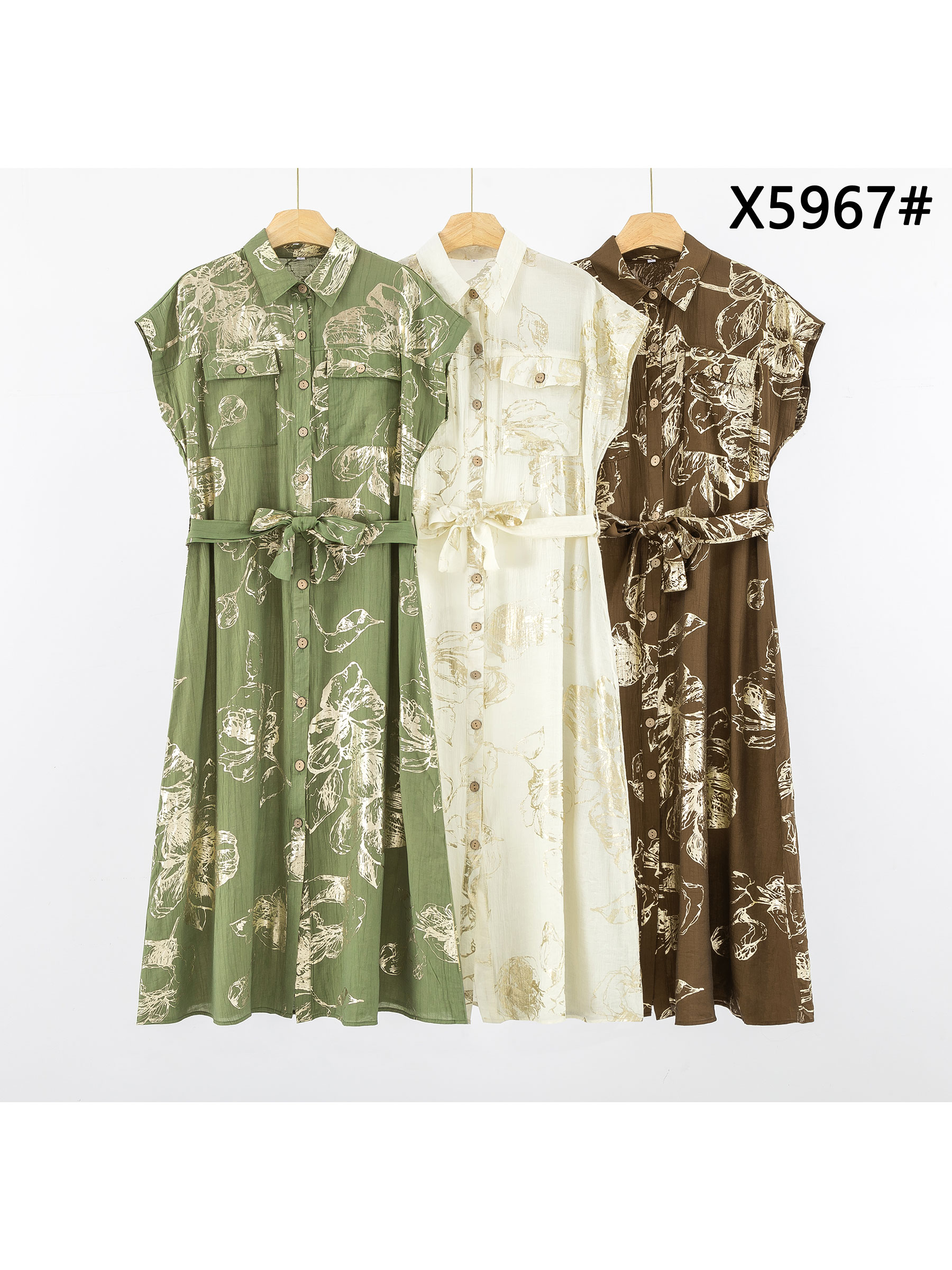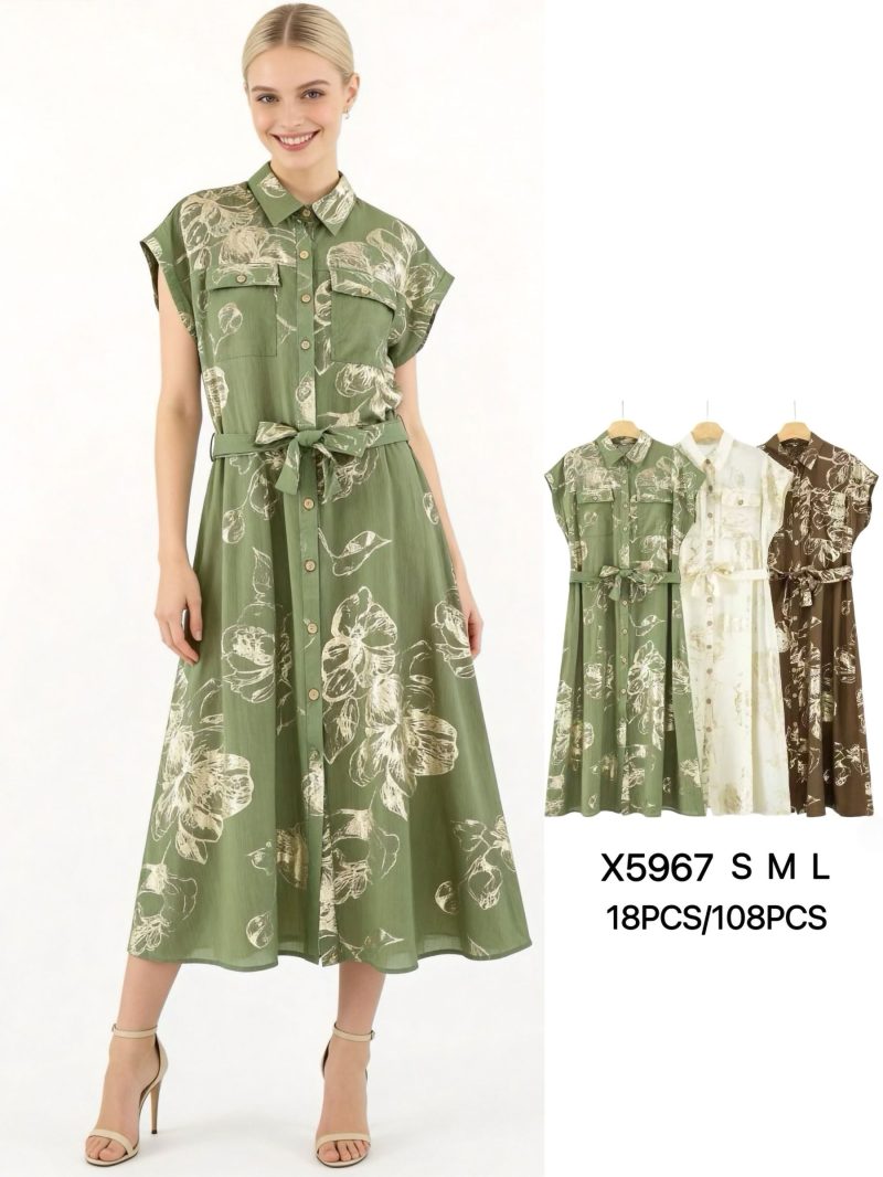 Hemdblusenkleid mit Blumenmuster, Goldeffekt und Gürtel
