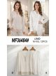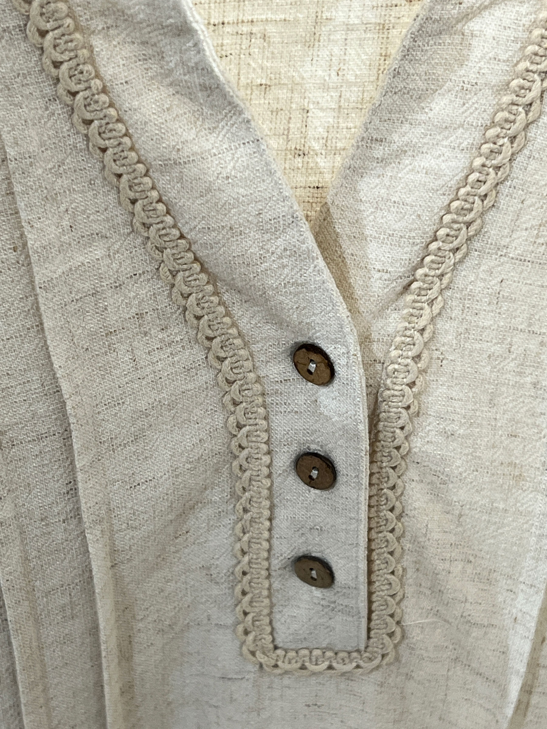 Linen effect blouse. V-neck with placket. Front buttons. Long sleeves. Pintuck front. Lace hem.