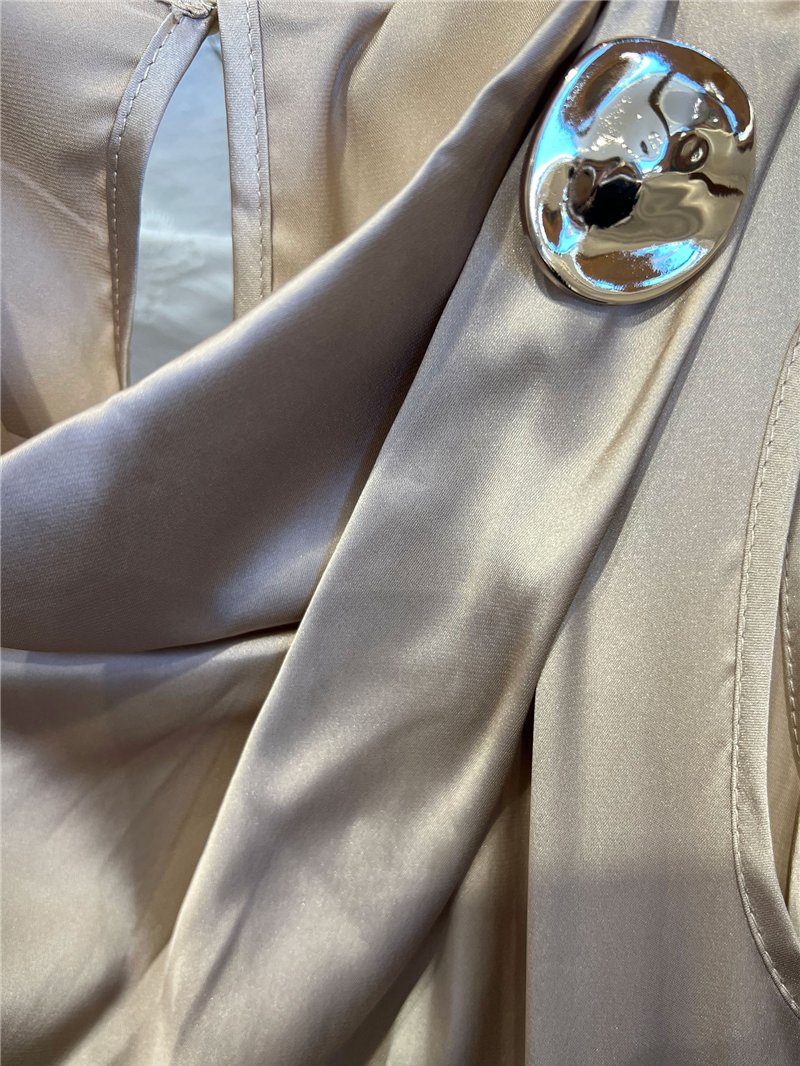 Elegant satin blouse. Soft draped neckline. Metal brooch shoulder detail. Sleeveless shape. Silky finish.