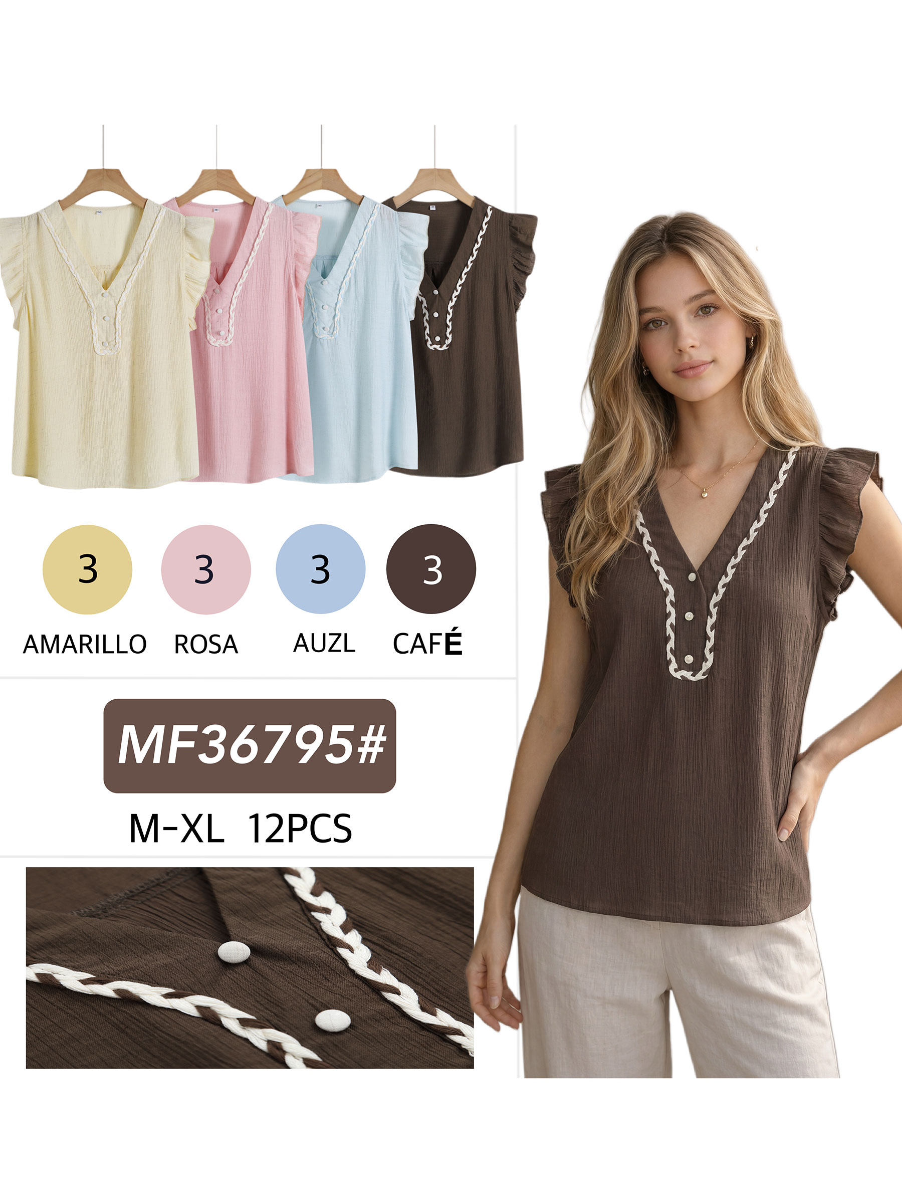 V-neck textured blouse. Braided trim neckline. Ruffle sleeves. Decorative front buttons. Crinkle finish fabric.