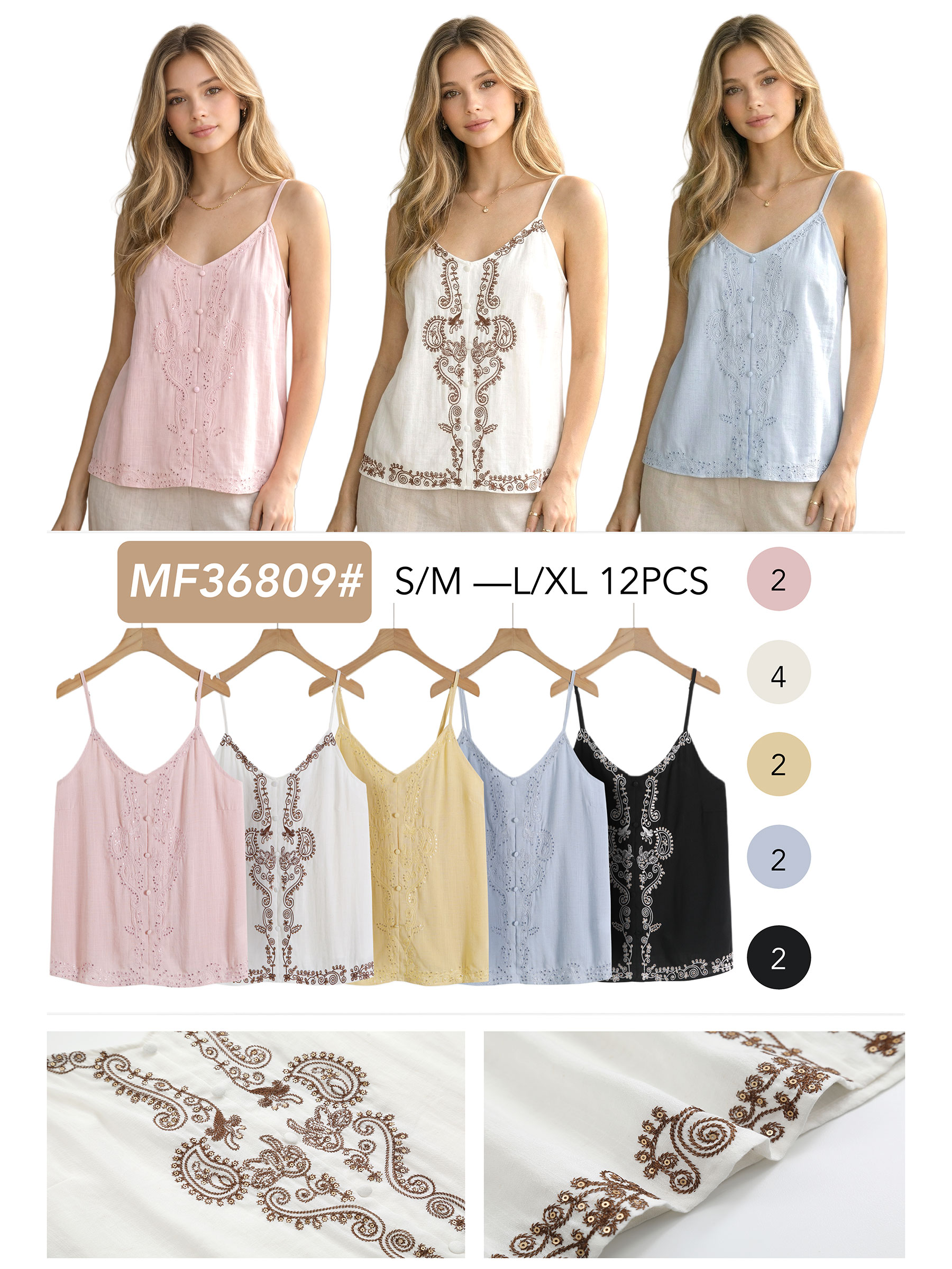 Embroidered cami top with sequins. Slim straps. V-neckline. Decorative front buttons. Straight hem.