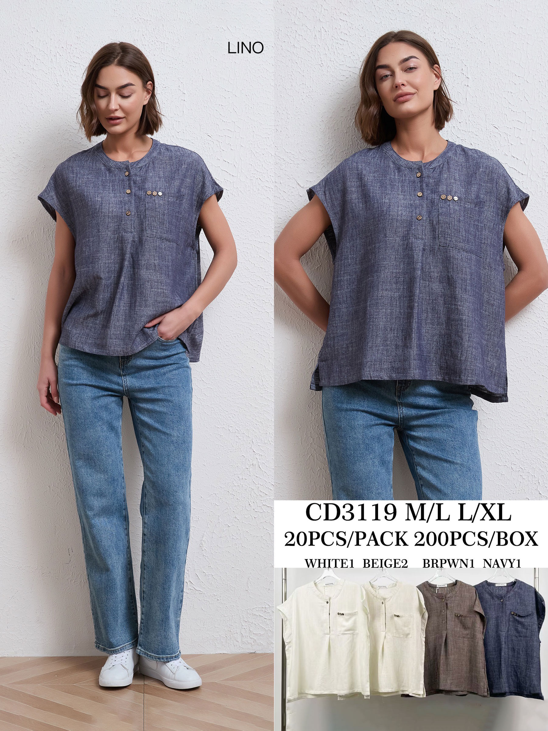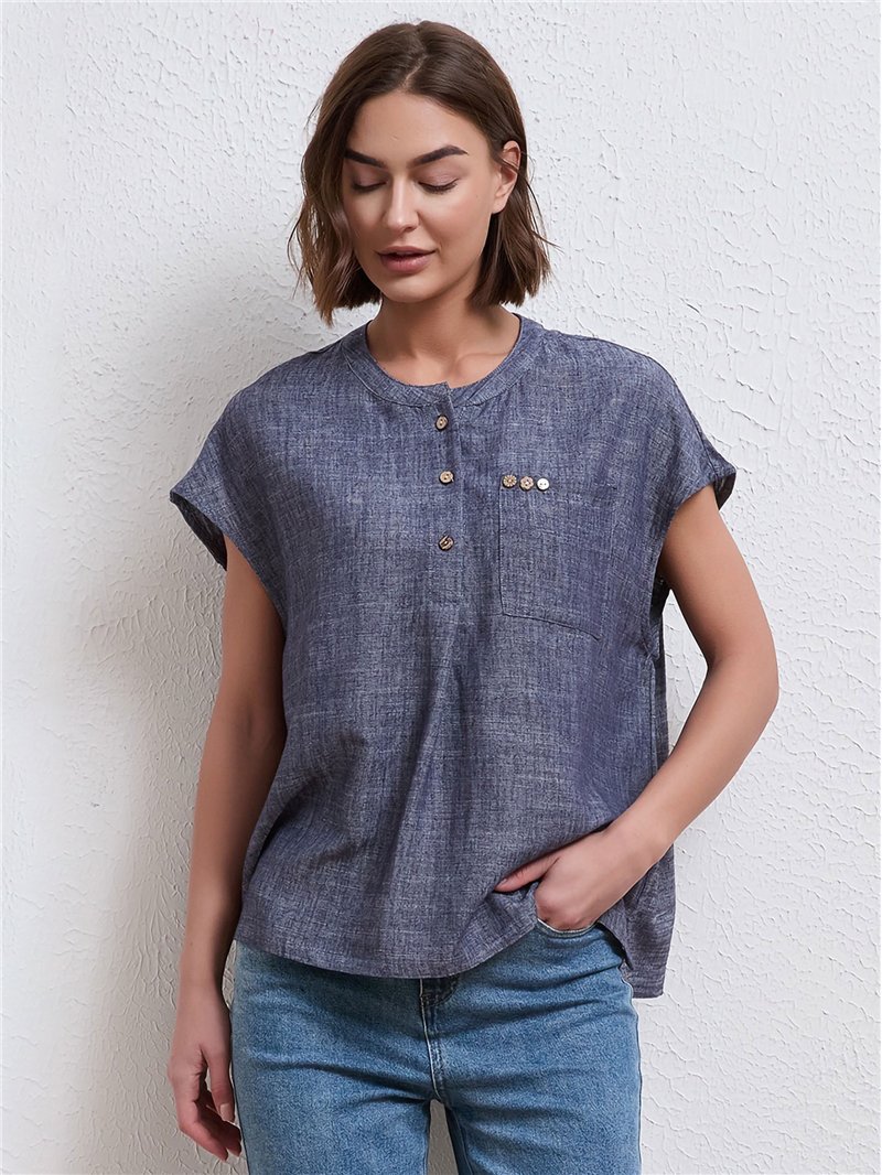 Linen effect button-detail pocket blouse