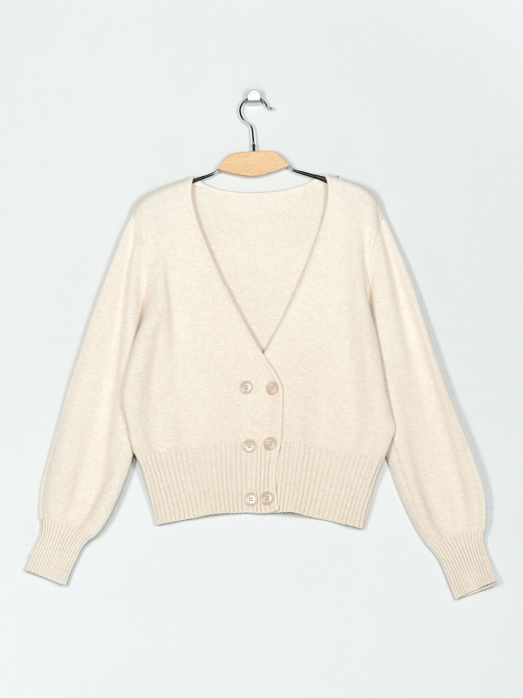 V-neck soft cardigan with long sleeves and double-breasted button fastening.