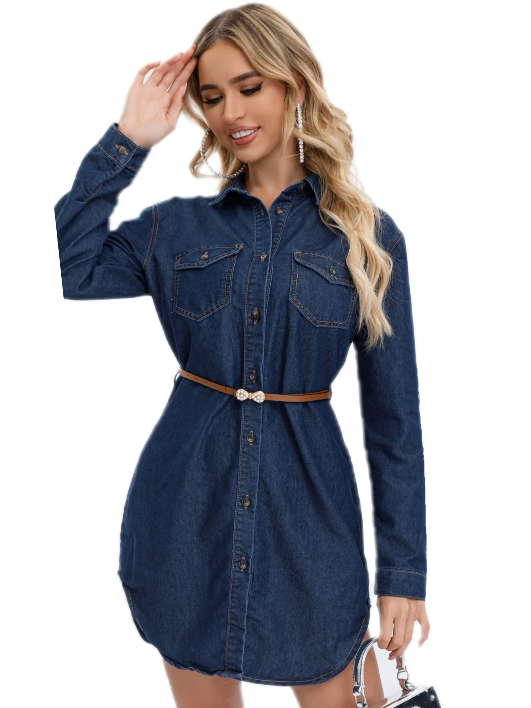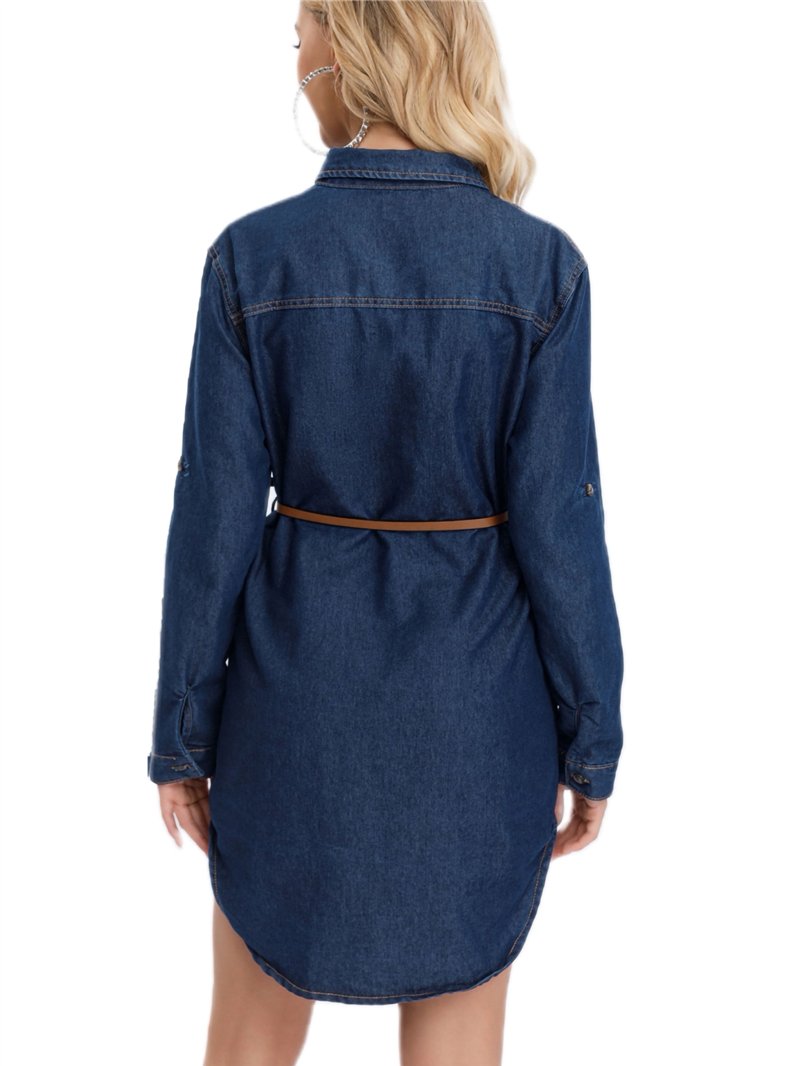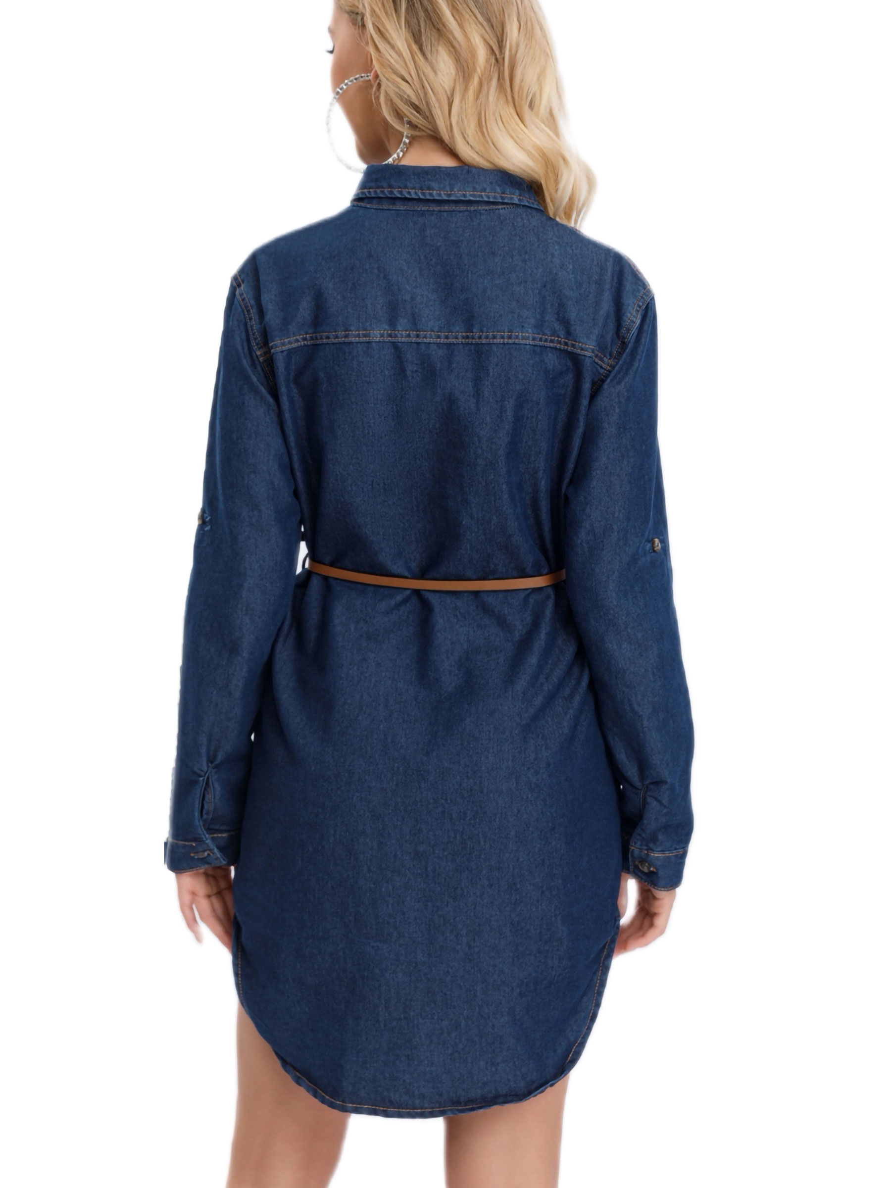 Non-stretch denim dress with a lapel collar. Long sleeves, featuring a contrast belt, chest patch pockets and button fastening.