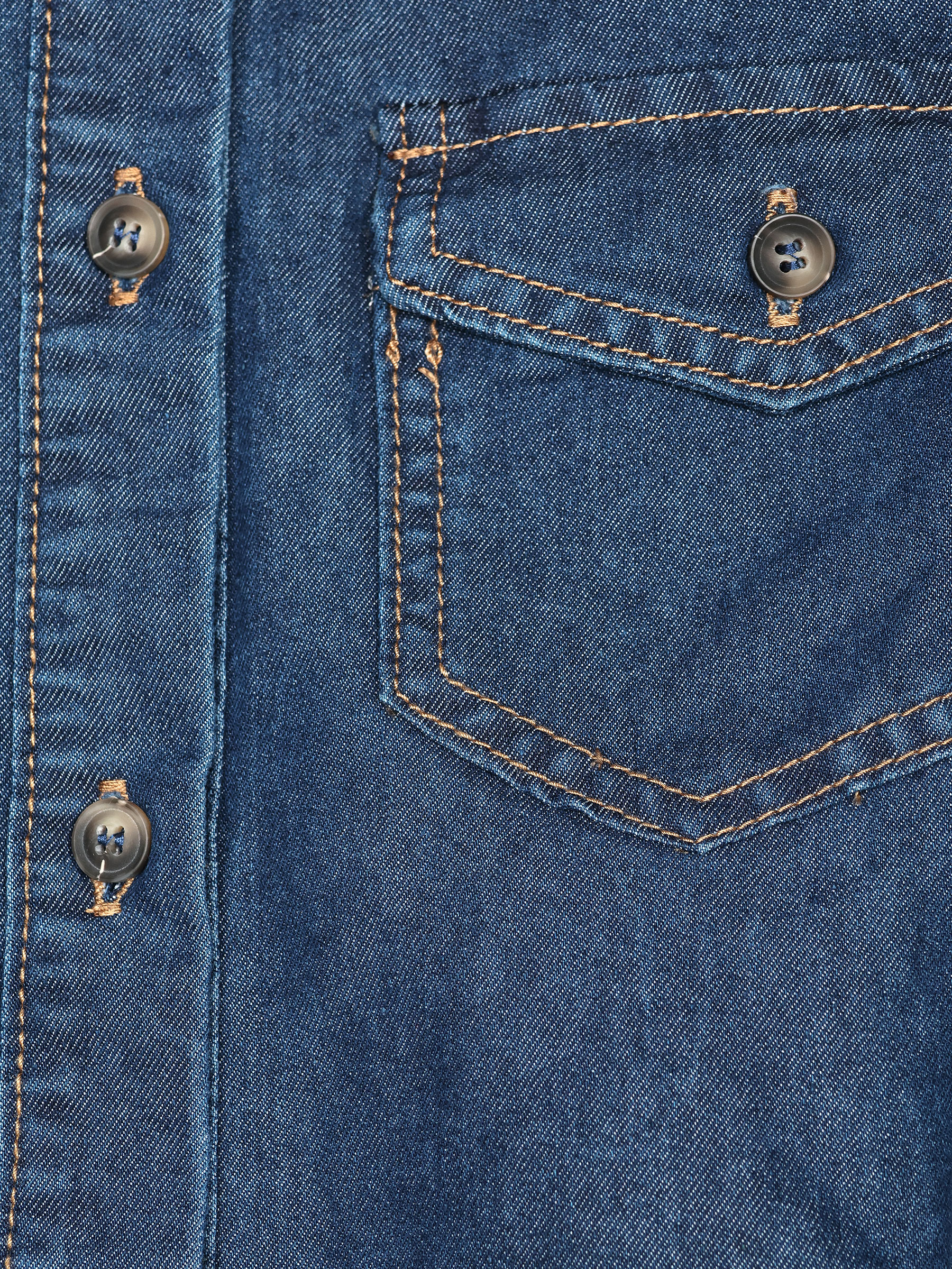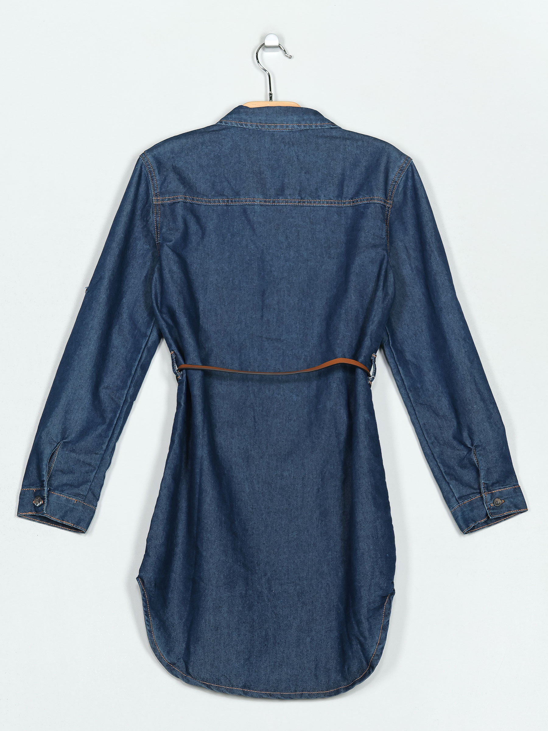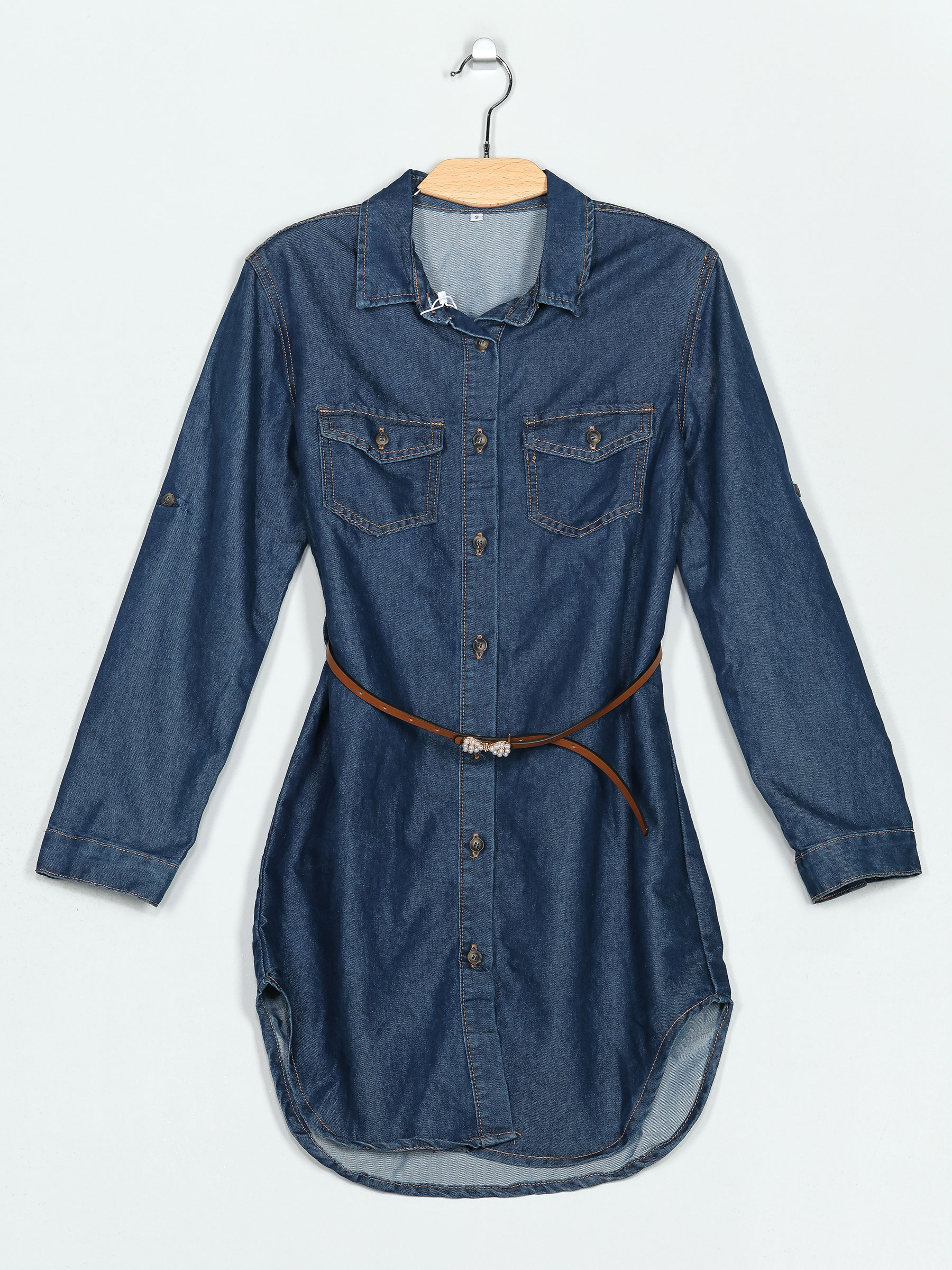 Non-stretch denim dress with a lapel collar. Long sleeves, featuring a contrast belt, chest patch pockets and button fastening.