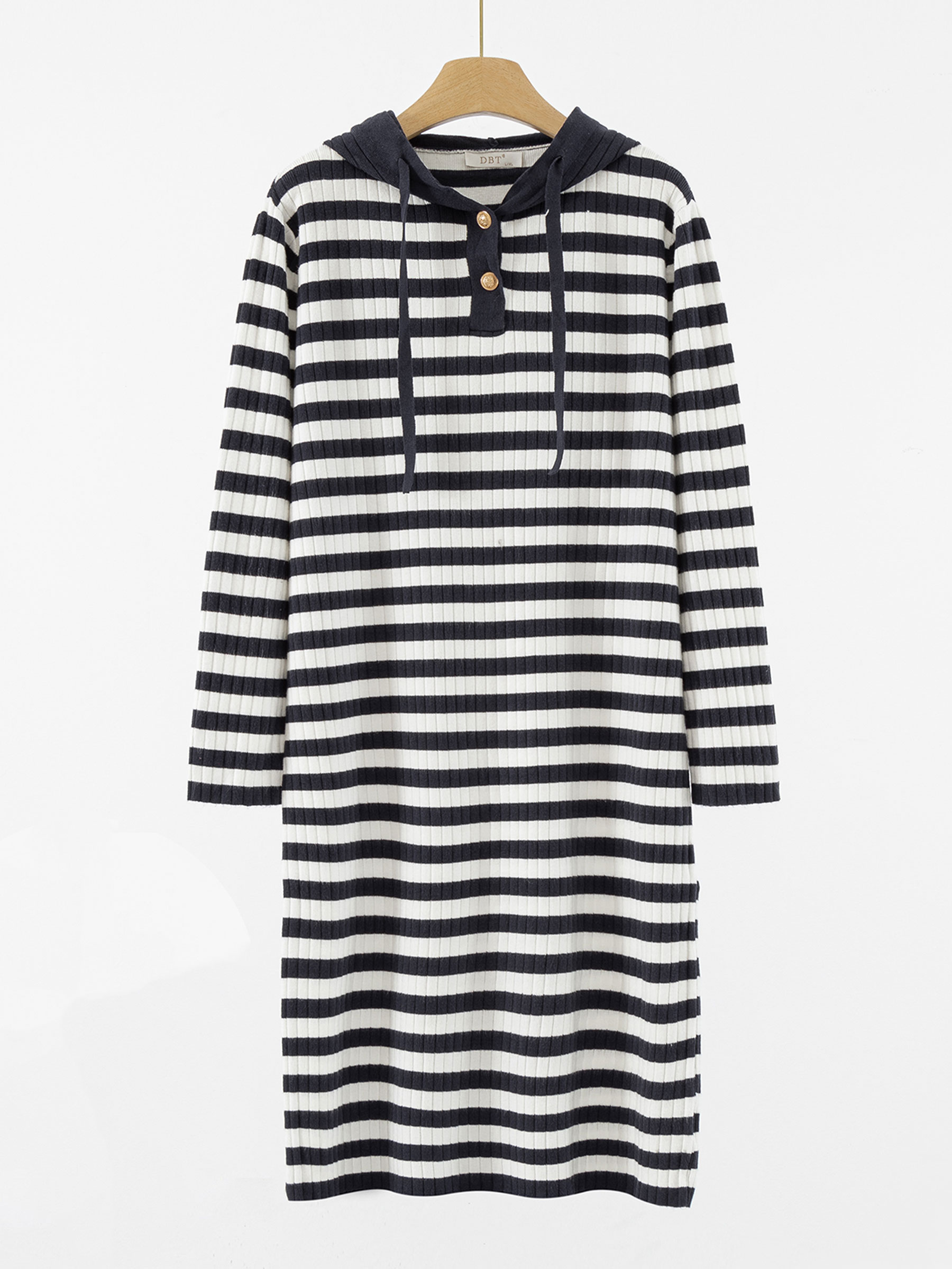Striped soft knit dress with hood. Long sleeves and buttons detail.