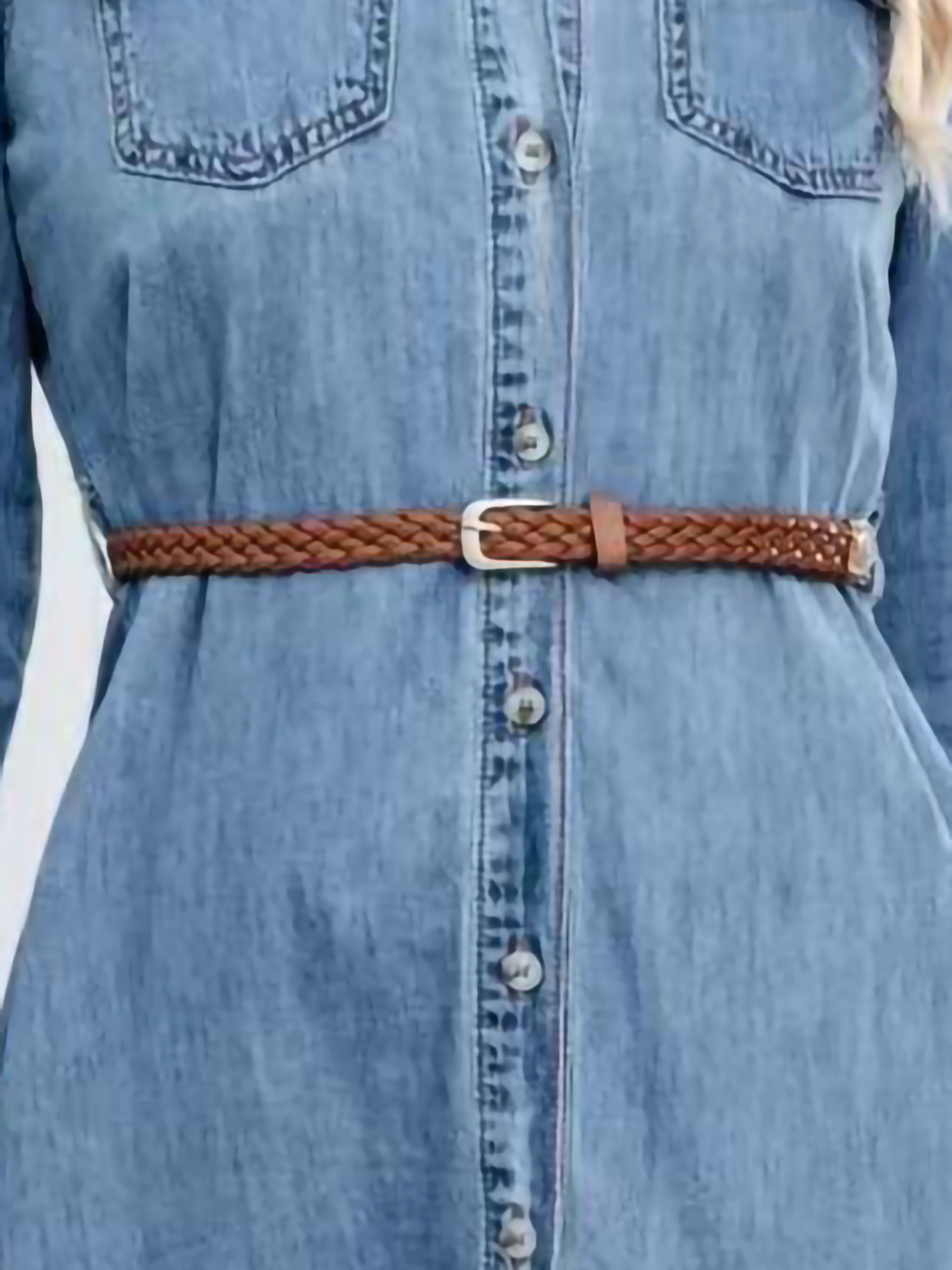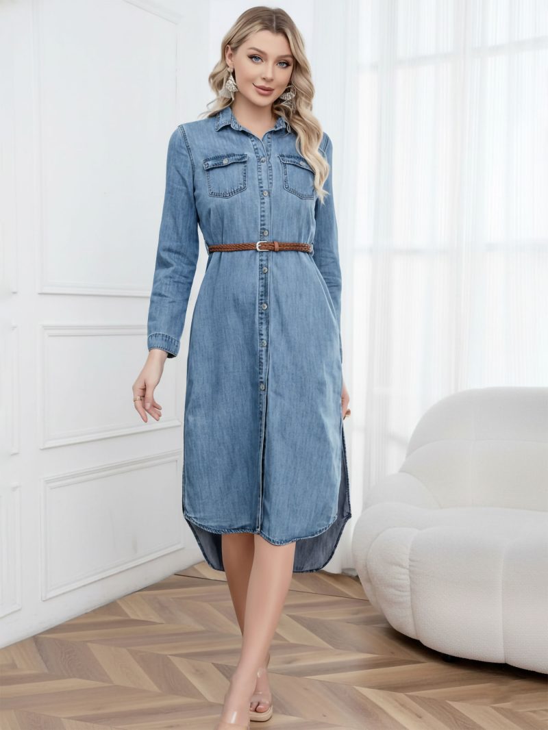 Midi denim shirt dress with a braided belt and side slits. Long sleeves, featuring chest pockets and button front.