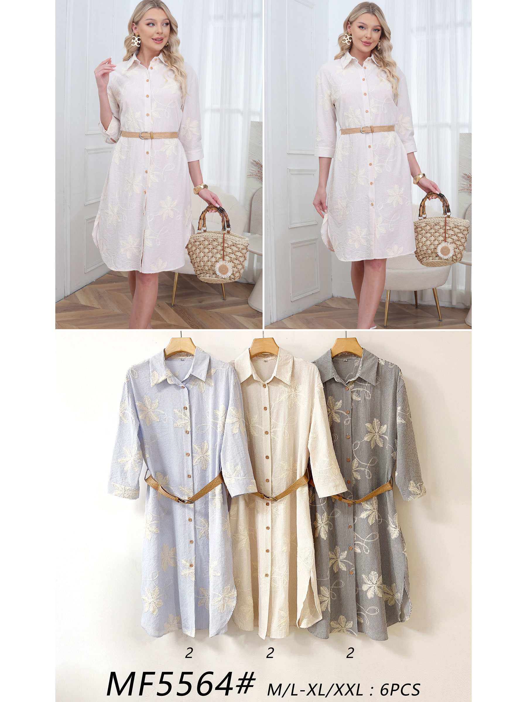 Shirt dress with contrast floral embroidery and button fastening. Three-quarter sleeves and a belt to define the waist.
