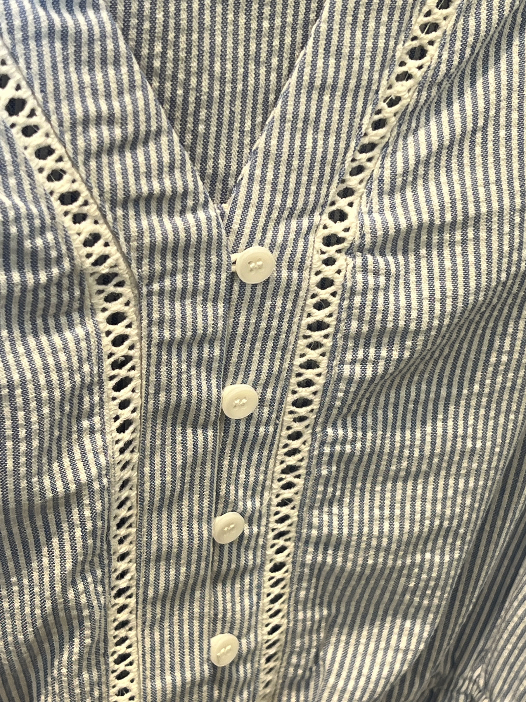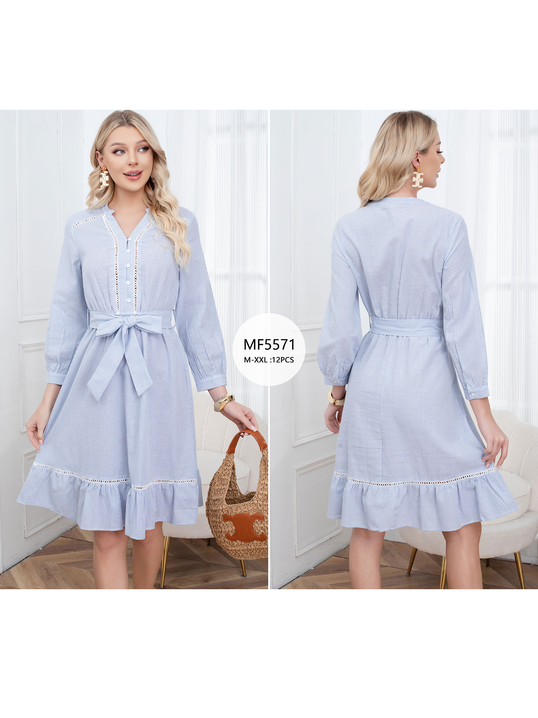 Pinstripe midi dress with a V neckline and delicate trim detail at the front. Matching tie belt to shape the waist and a ruffle hem.
