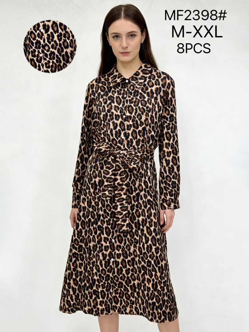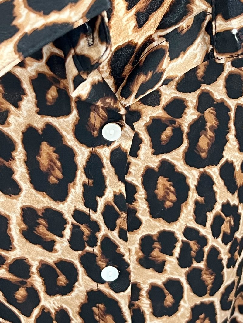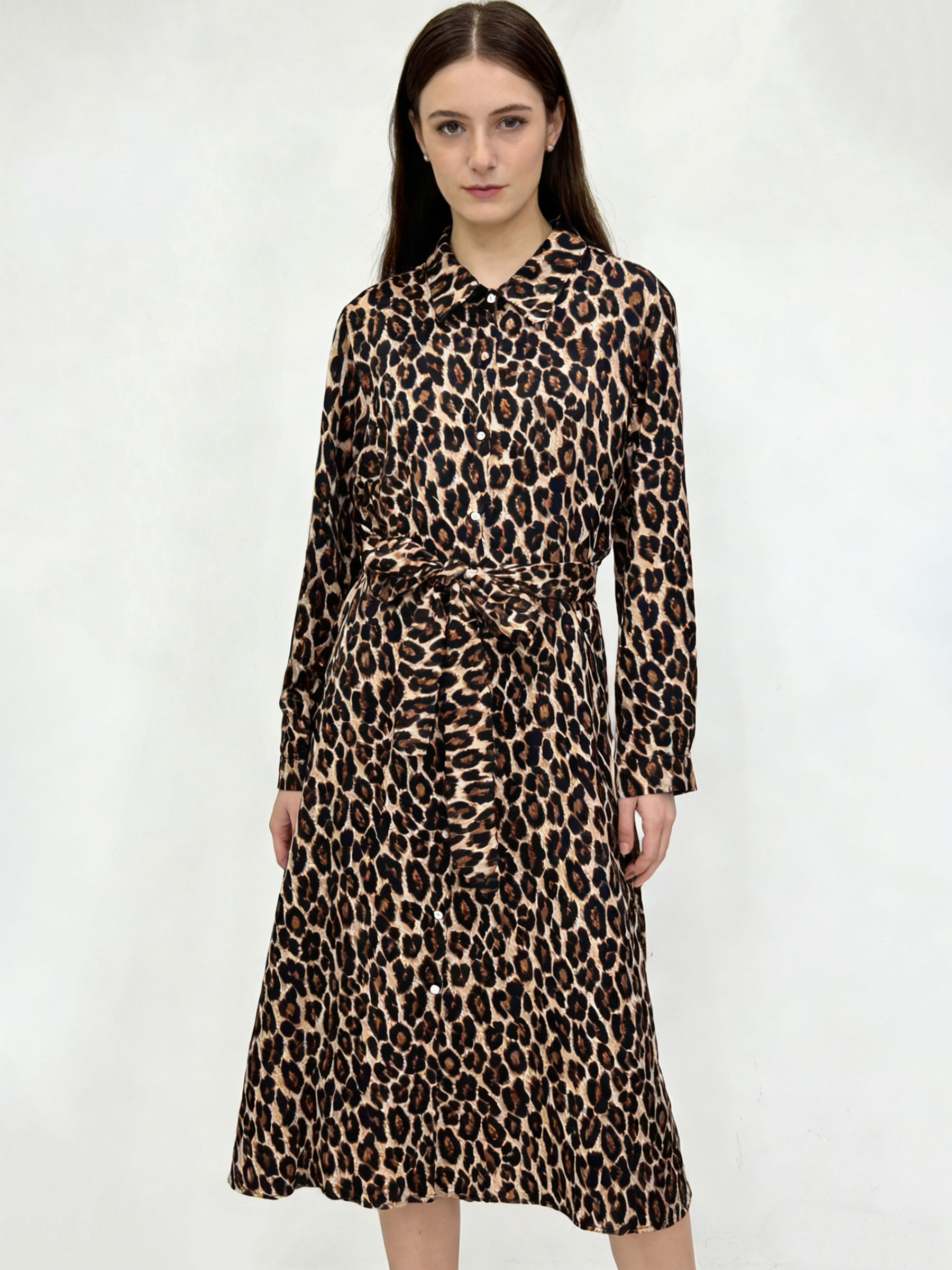Leopard shirt dress. Point collar. Button front. Self tie belt. Long sleeves. Midi length.