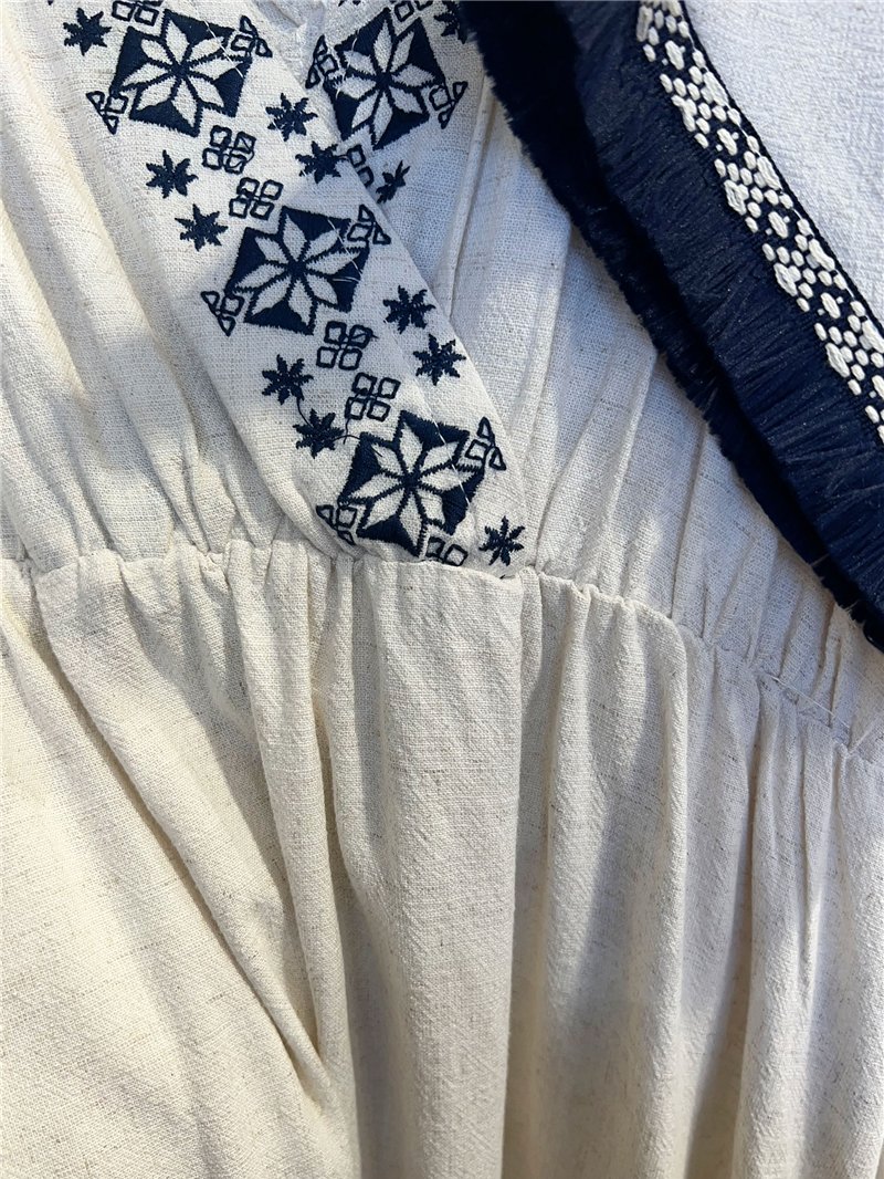 Maxi dress. Surplice V neckline. Wide short sleeves. Contrast embroidery at the neckline and hem. Elastic waist. Linen look fabric.