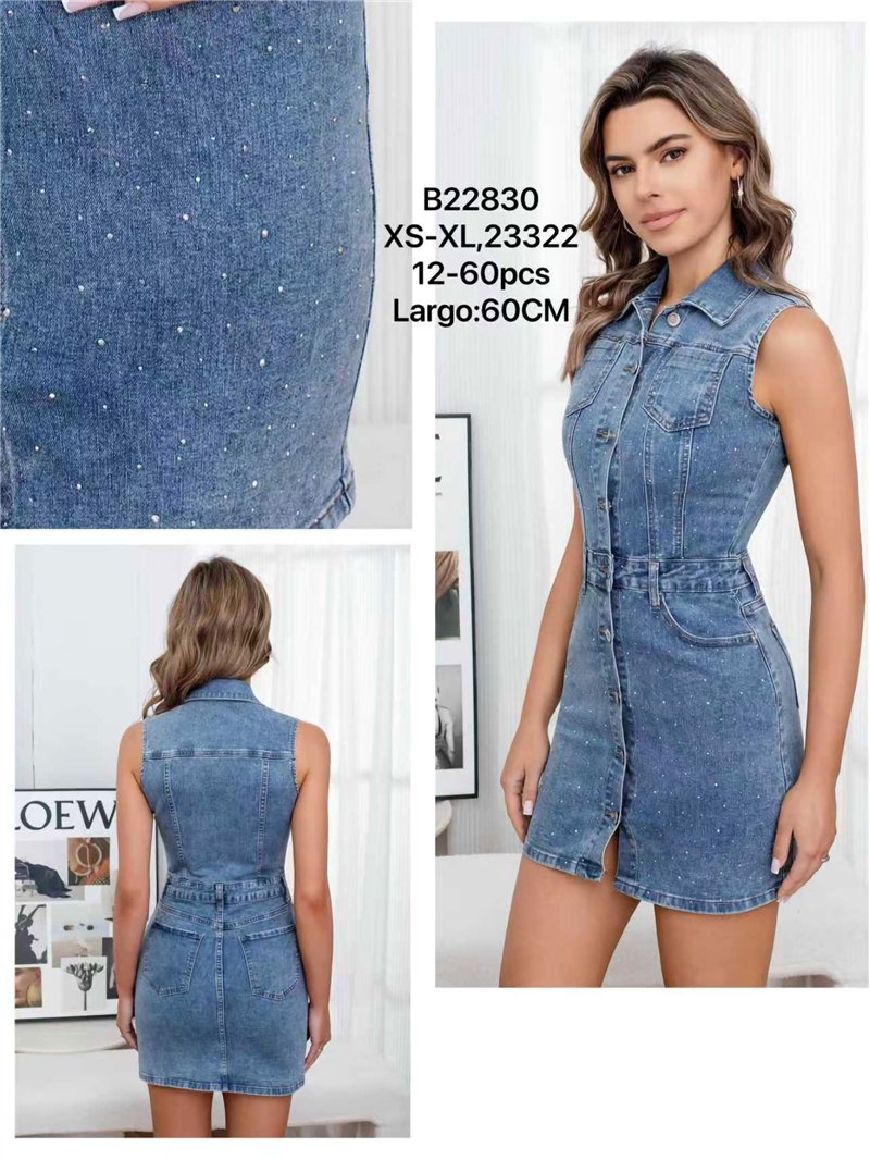 Denim mini dress. All-over sparkle detail. Shirt collar. Sleeveless cut. Button-through front. Length 60 cm.